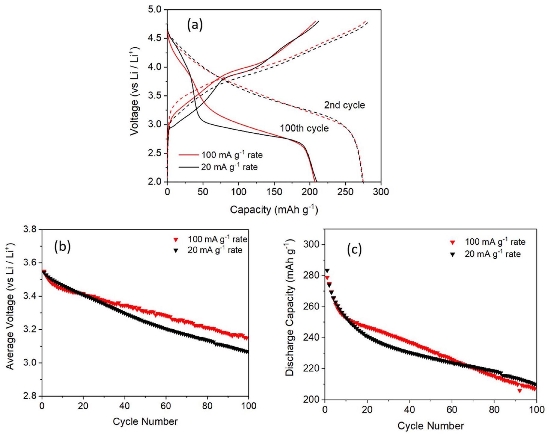 Extended Data Fig. 2 | Electrochemical cycling data at different rates. (a) Cycling data collected at different current rates of 100 and and . A similar degree of voltage (b) and capacity (c) fade is observed.
