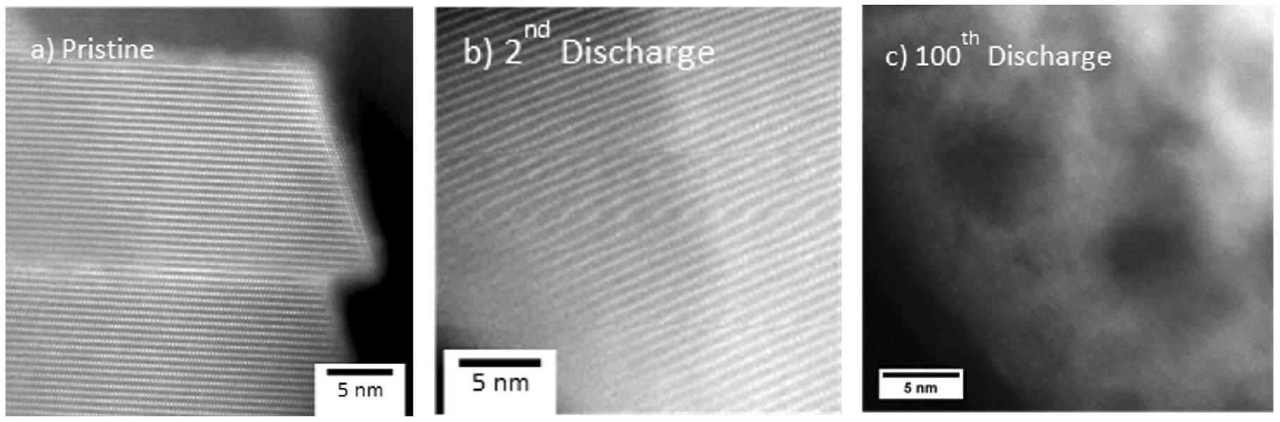To examine the origin of the diminishing extent of formation and reduction with cycling, annular dark field (ADF)-STEM imaging was carried out to probe changes in the particle microstructure. The images shown in Fig. 4a-c and Extended Data Figs. 4 and 5 illustrate substantial changes within individual grains of after 100 cycles, consistent with previous reports identifying void formation and growth using SAXS, STEM and three-dimensional tomography . Comparing the images for the pristine and 2nd discharge with the 100th discharge clearly shows the development of very extensive voiding with a high density of voids, as seen by the darker areas. The voids vary from about in size and appear to be distributed throughout the particle. Given the high density of voids it is likely that a number of these voids are interconnected leading to pores of larger dimensions than is apparent from STEM.