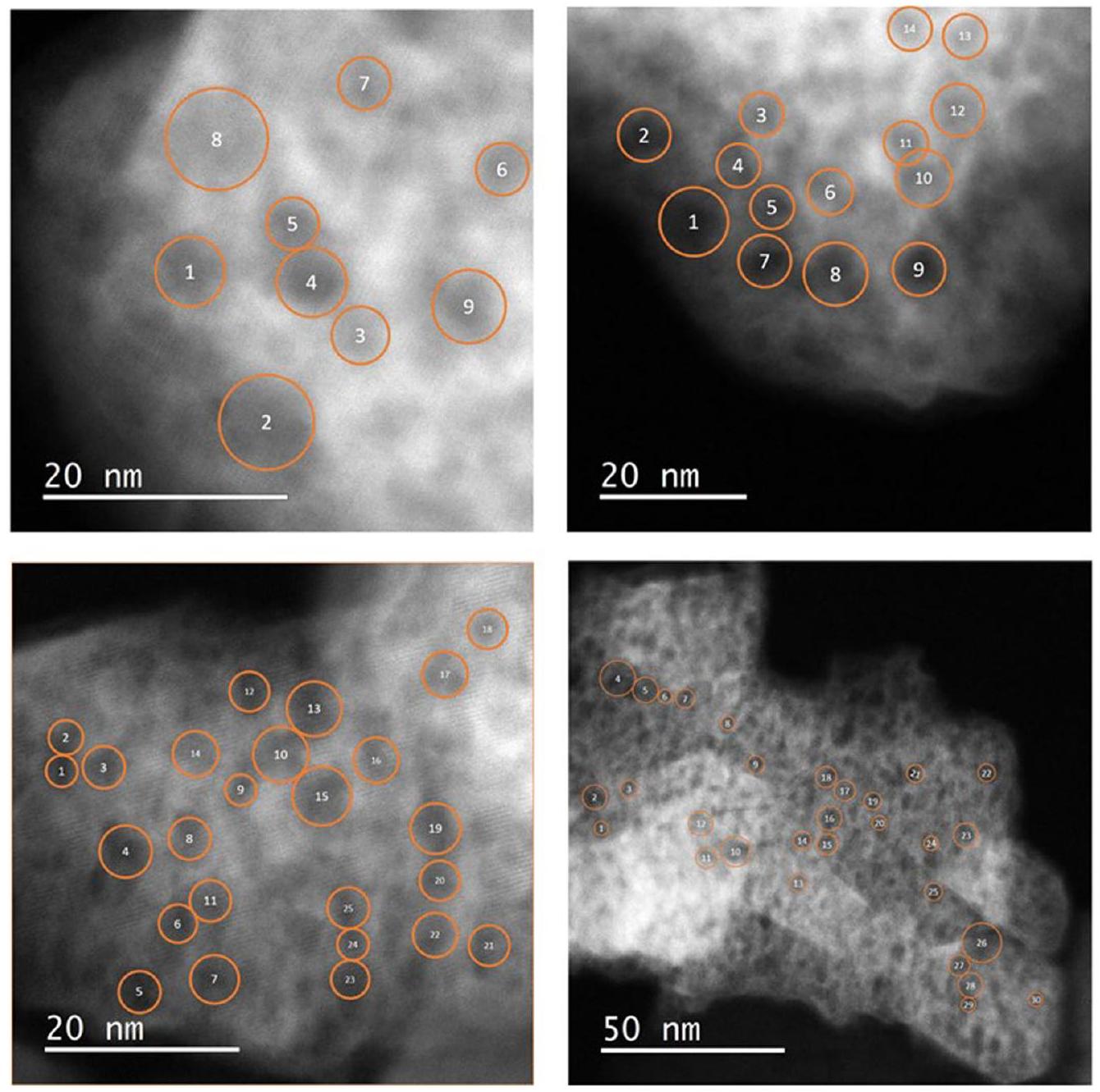 Extended Data Fig. |ADF-STEM images for samples collected after the cycle. Voids are outlined in orange and range in dimensions from to . The likely interconnection of several of these voids is apparent.