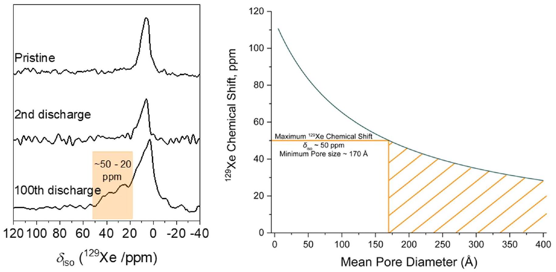 To investigate the extent to which the voids are closed or open, Xe NMR was used. Xenon-129 ( ) is an inert gas with a large polarizable electron cloud, giving xenon a wide chemical shift range . When is constrained within a void, it comes into contact with the surface of the void causing the electron cloud to be distorted and a chemical shift to be observed . This shift has a well-known relationship with void size that has been experimentally determined, described in Extended Data Fig. 6 (ref. 39). was first degassed under