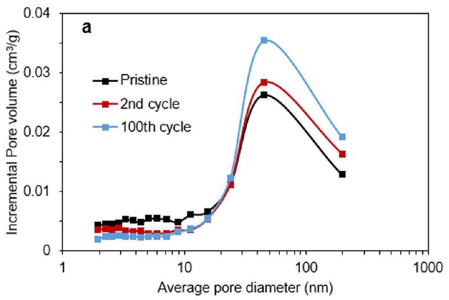 The NMR and BET data show that the cathode particles develop increased density of open voids in diameter at the particle surfaces on cycling. There is also a wider body of evidence showing that Li-rich NMC suffers from particle cracking, which had commonly been associated with increased lattice strain . Together this suggests that the increased density of relatively large voids filled with upon cycling may result in weakening and hence fracturing of the particles, releasing from open or partially open voids at or near the surfaces of the particles and explaining its loss on extended cycling release (Fig. 6).