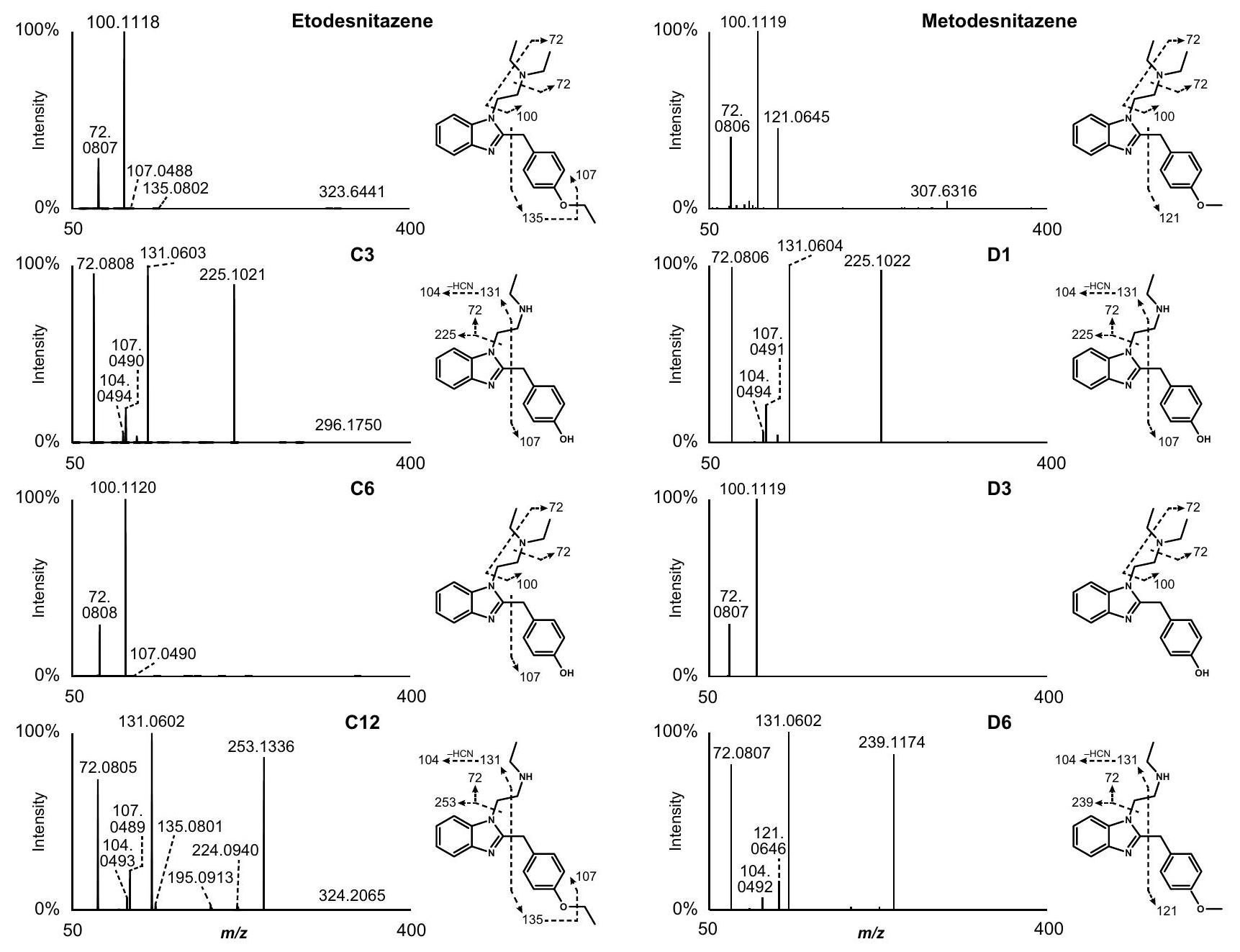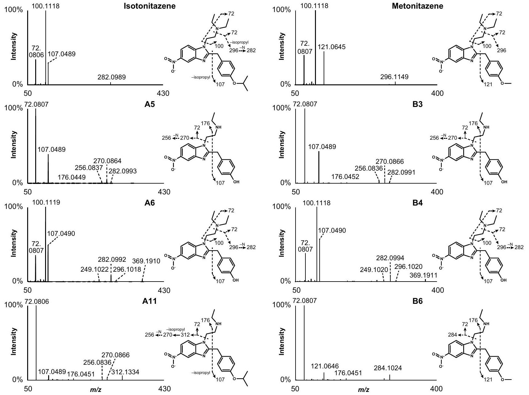 HRMS/MS fragmentation pattern of isotonitazene, metonitazene, etodesnitazene, and metodesnitazene