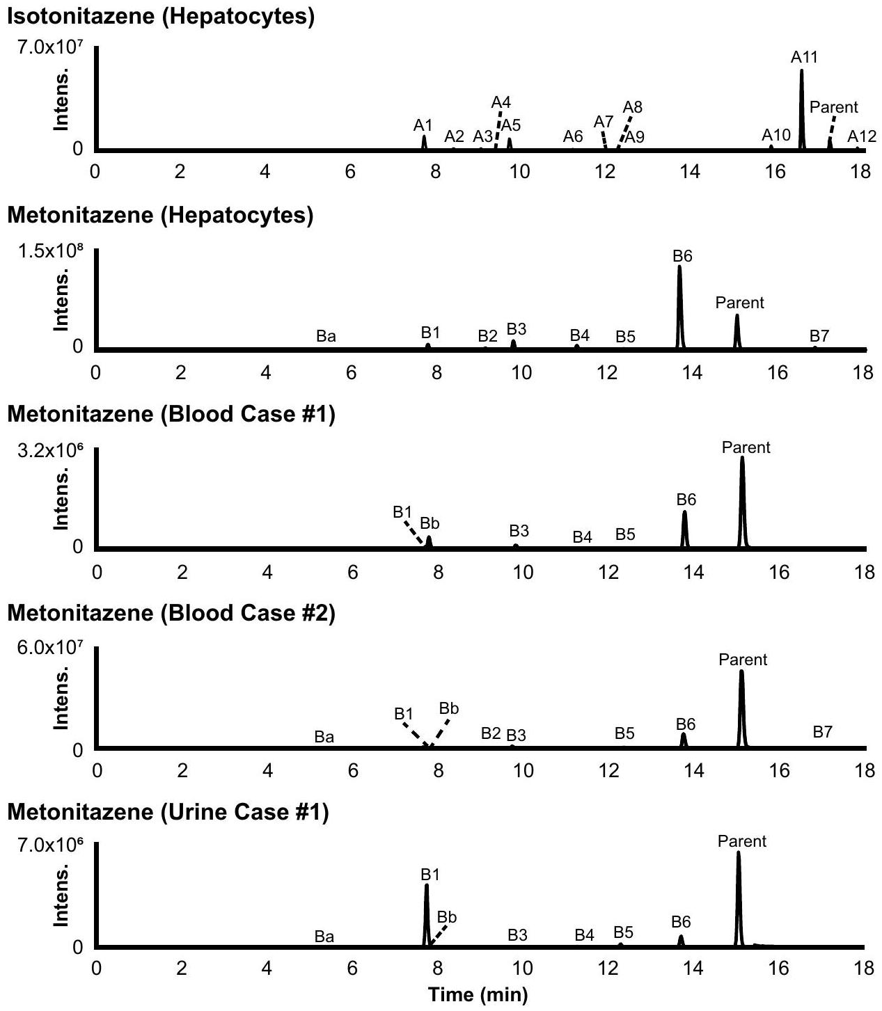 metabolites were detected with a much lower intensity in metonitazene incubates compared to authentic samples, potentially indicating extra-hepatic metabolism. Contrary to our observations, Krotulski et al. found that 5 -aminometonitazene was the main metabolite in the blood of all 14 cases in which metonitazene metabolites were detected (Krotulski et al. 2021). The authors prepared the samples with a liquid-liquid extraction, which might have affected the relative recovery of the metabolites, but, conversely, the protein precipitation of the present study might have affected the relative matrix effect of the metabolites. Other potential reasons to this discrepancy might be due to the instability of the metabolite, a different postmortem redistribution, or interindividual genetic variations. Further investigation with a purified reference standard of the metabolite is necessary to further understand its significance.