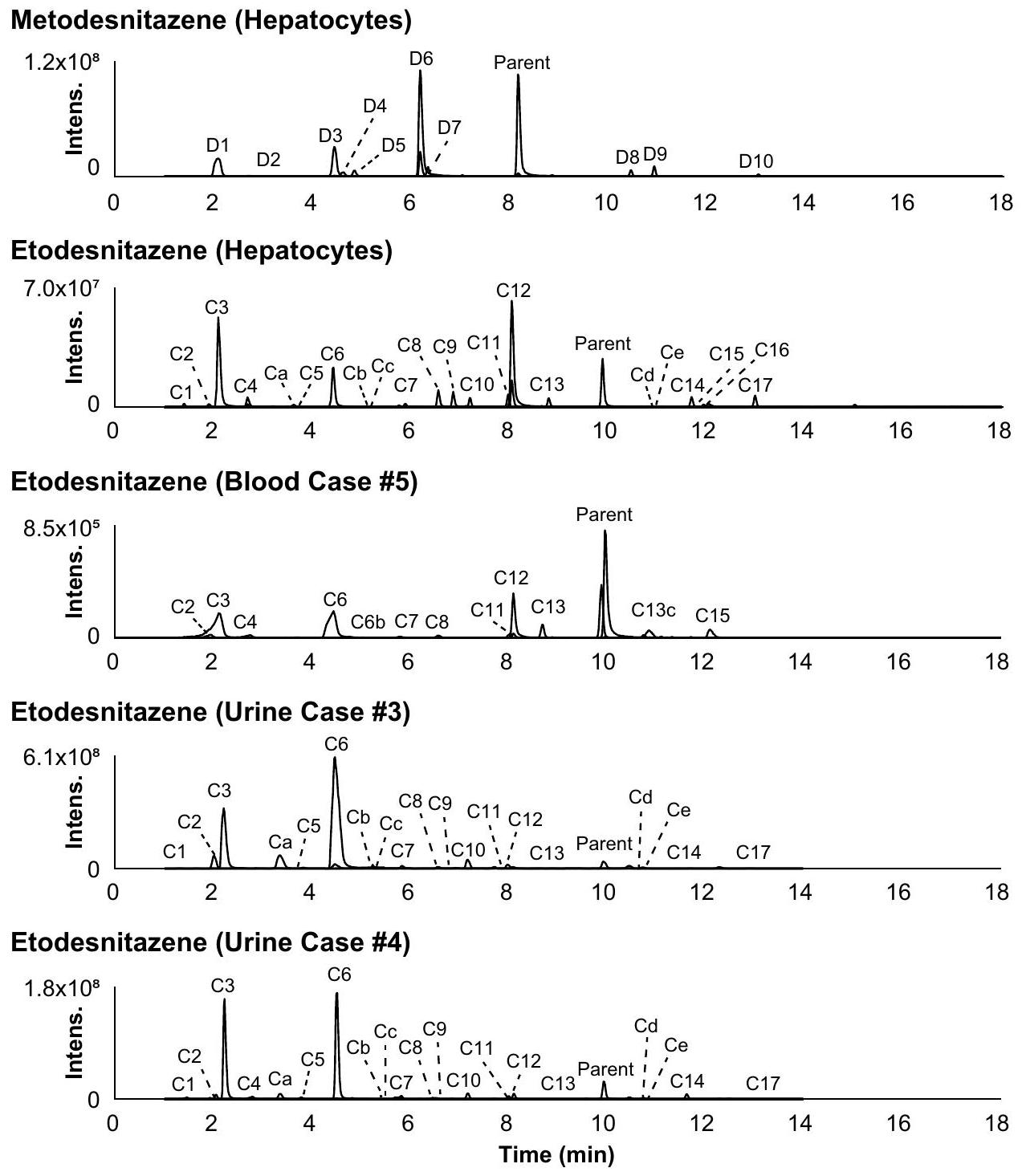 (4′-hydroxyl-nitazene) was confirmed through the injection of the commercially available reference standard.