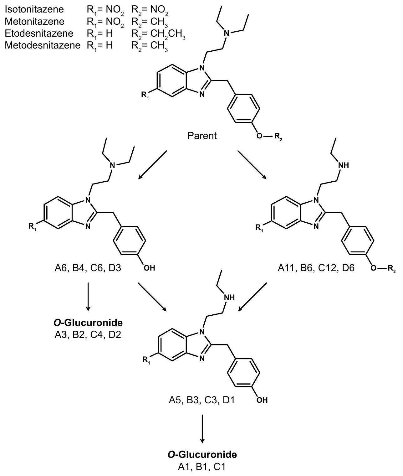 الأيض البشري لأربعة أفيونات بنزيميدازول الاصطناعية: إيزوتونيتازين، ميتونيتازين، إيتوديسنيتازين، وميتوديسنيتازين