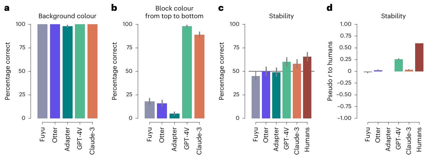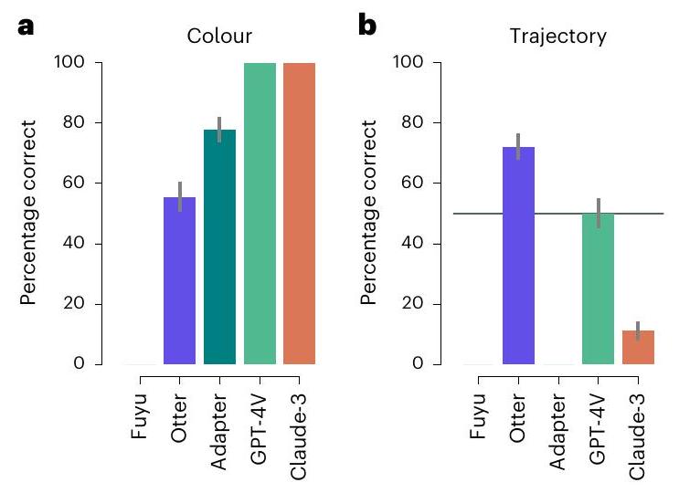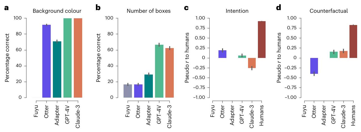 questions. We submitted them to some of the currently most advanced LLMs. To evaluate whether the LLMs show human-like performance in these domains, we follow the approach outlined in ref.73: we treat the models as participants in psychological experiments. This allows us to draw direct comparisons with human behaviour on these tasks. Since the tasks are designed to test abilities in specific cognitive domains, this comparison allows us to investigate in which domains multimodal LLMs perform similar to humans, and in which they don’t. Our results showed that these models can, at least partially, solve these tasks. In particular, two of the largest currently available models, OpenAl’s Generative Pre-trained Transformer (GPT-4) and Anthropic’s Claude-3 Opus, managed to perform robustly above chance in two of the three domains. Yet crucial differences emerged. First, none of the models matched human-level performance in any of the domains. Second, none of the models fully captured human behaviour, leaving room for domain-specific models of cognition such as the Bayesian models originally proposed for the tasks.