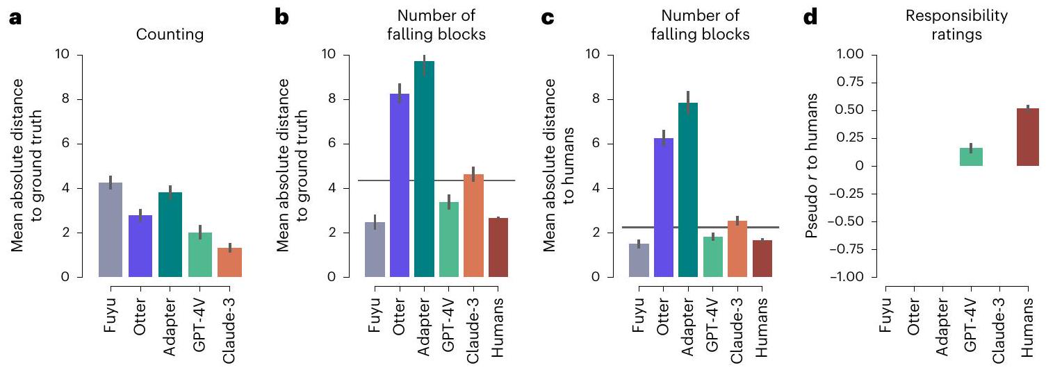 approximated the ground truth, albeit rarely matching it exactly. Therefore, we report the mean absolute distance to the ground truth instead of the percentage of correct answers (Fig. 3a). The models’ performance highlighted the challenging nature of this task, with the best performing model (Claude-3) still being on average more than one block off.