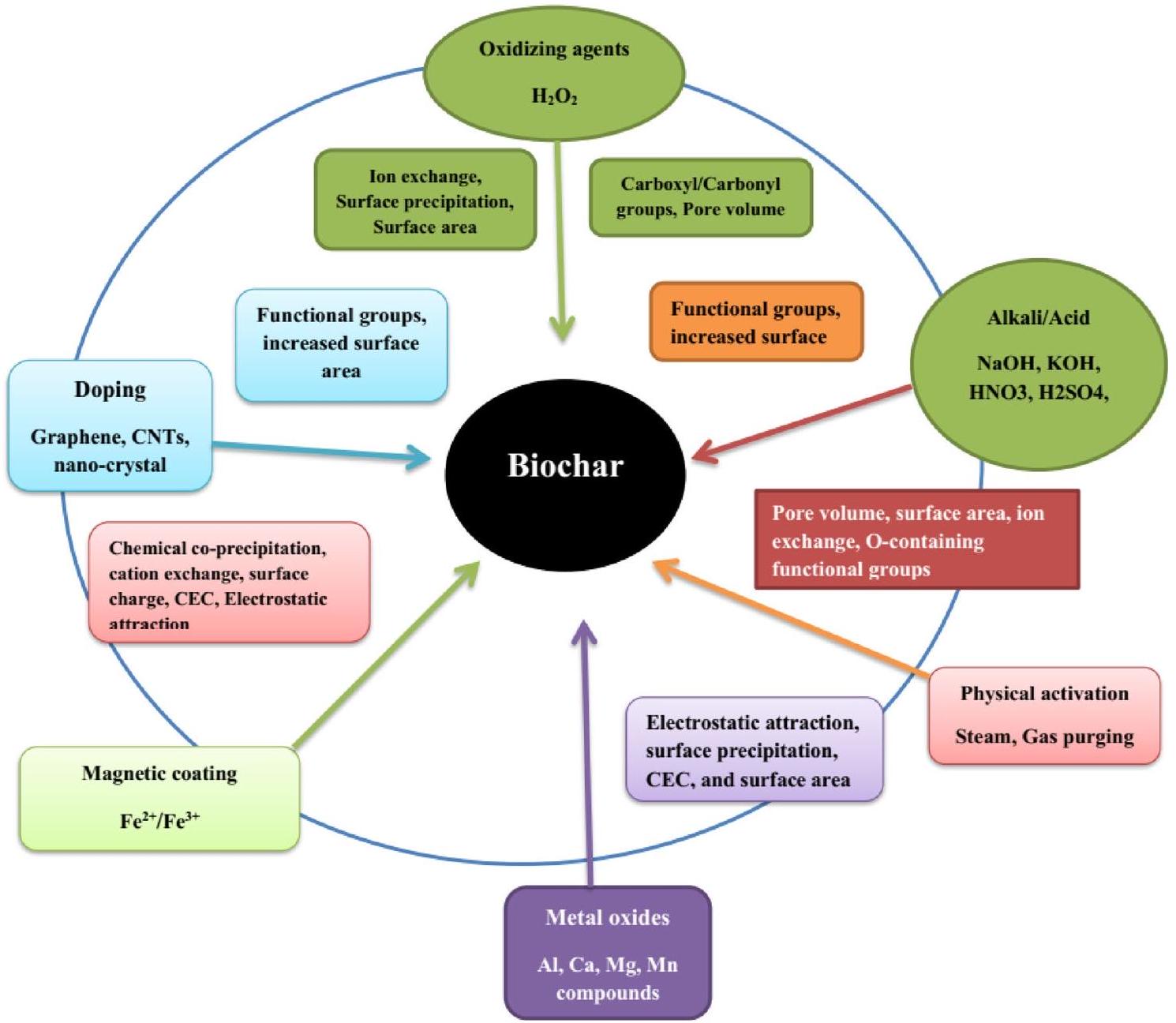 تمت مراجعة تقنيات التعديل القابلة للوصول في الأدبيات المنشورة وتلخصت في (الجدول 1) الذي يمكن تقسيمه إلى 4 فئات رئيسية، بما في ذلك التعديلات الفيزيائية والكيميائية، التعديلات المغناطيسية، والنقع بالمعادن (الشكل 2). التغييرات في الخصائص الفيزيائية والكيميائية للفحم الحيوي بعد تعديلات متعددة موضحة بالتفصيل في (الجدول 2).