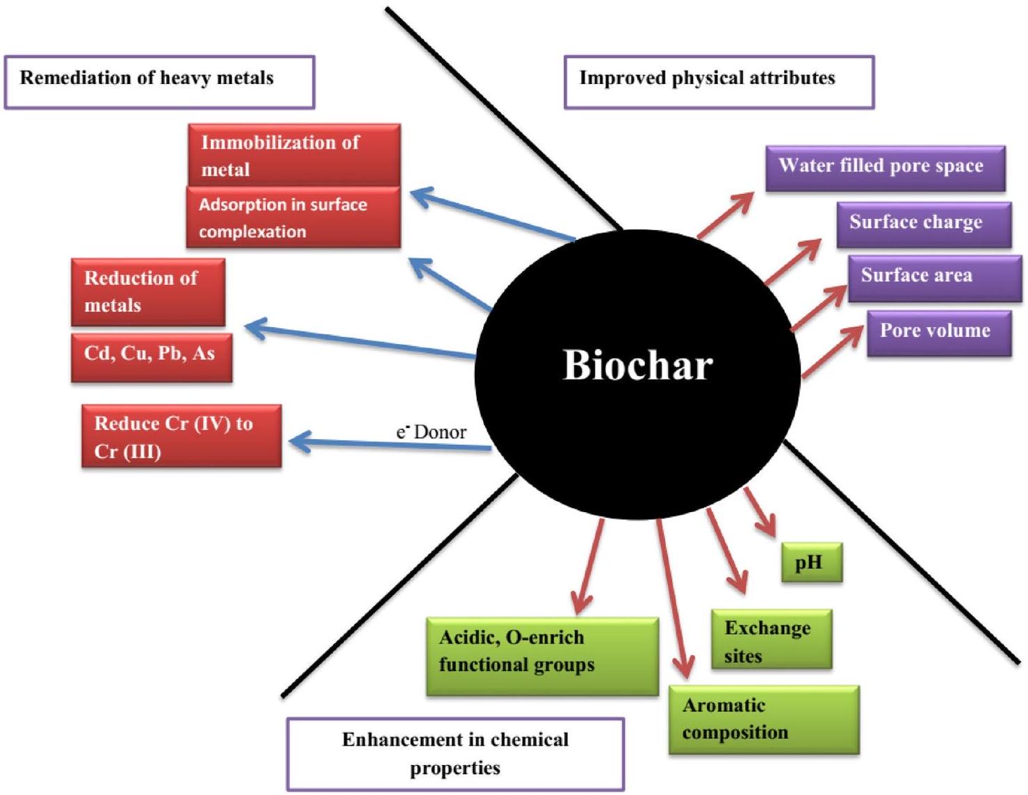 Based on the above discussion, multiple modifications/engineering strategies have been employed to improve the physicochemical and biological properties of biochar. The multiple-functionalized biochars have been successfully utilized for the remediation of soil and aquatic systems contaminated by various pollutants. The specific attributes of multiple-modified biochar including the appearance of new functional groups, enhanced surface area, and greater electron transport capability are amongst the main factors affecting the remediation efficiency in multifaceted applications. Generally, functionalized biochar is an environmentally friendly catalyst/adsorbent