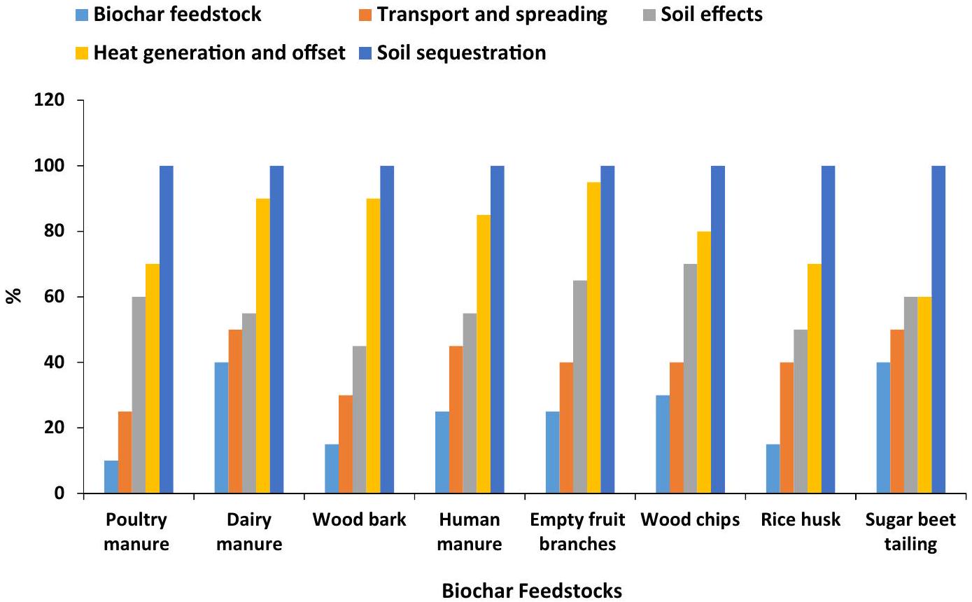Pan et al. reported that the production cost of biochar from various biomasses has seldom been enlisted in previous literature. The cost of biochar depends on various factors including availability, collection, and transportation of raw biomass and scale, production technology, handling, and supply. Given biochar fabrication factors and transportation is the most significant parameter. They noticed the economic feasibility of making two kinds of biochar in three states and exposed that the net present cost of biochar increases with the reduction in movement of mobile pyrolysis unit. Figure 6 displays the economic paybacks of biochar utilization. Another significant factor of interest is the cost of labor in biochar fabrication, which varies globally as comparatively high in the USA and UK (about ) and less in India and the Philippines . In general, biochar cost varies in several states of the globe, where, Shen et al. and Bhavani et al. figured to of the biochar. Qiu et al. also noticed that the biochar was sold for about to farmers and suggested the price of biochar as ( to ). Different kinds of biochar costs such as coconut coir, wood waste, and yard waste, , , and respectively have been valued in previous studies . Contrastingly, the cost of wood and yard waste biochar is greatly less than other materials such as (activated carbon ), and (zeolites ) as well as other biochar ( to ), thus these could be utilized as a cost-effective and efficient material for nutrients restores from contaminated water . Additionally, food waste feedstock is a profitable choice because of its low cost and easy availability. These characteristics limit the biochar fabrication cost from food waste to than that of conventional feedstocks . Biochar production is gaining attention because of its auspicious potential in the environment and energy. Gupta et al. presented the economic supposition results for the biochar production in Selangor at year and the total income from the sale of biochar was year. Therefore, the net present cost for biochar fabrication, which was measured via the investment amount and the net income, exhibited positive outcomes of the economic feasibility of biochar . Cost- effectuality of biochar fabrication depended on its retailing price, with a break-even of around for pyrolysis at and approximately for pyrolysis at . Panwar and Pawar revealed that yard waste was confirmed to be auspicious feedstock for biochar creation with a net margin of and for the low and high-income scenario of carbon dioxide equivalents ( ), such as horse and cattle manures. Thus, the production of biochar can be tempting if the proceeds of the above costs offset the economic prices of elevating, hauling, harvesting, and storing the feedstock, besides those of applying pyrolysis, transportation, and application of the biochar. As reported from the examination, the net margin of biochar production could be enhanced with low-cost feedstock and an auspicious processing approach .