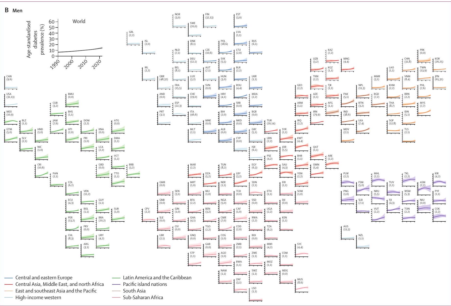 كندا، بالإضافة إلى العديد من الدول الجزرية في بولينيزيا وميكرونيزيا، حيث كانت نسبة الانتشار مرتفعة بالفعل في عام 1990. في 131 دولة أخرى للنساء و155 للرجال، زادت نسبة انتشار السكري المعدلة حسب العمر باحتمالية خلفية تزيد عن 0.80. تراوحت الزيادةنقاط مئوية في النساء وفي الرجال. كانت الدول التي شهدت أقل زيادة في أوروبا وأفريقيا جنوب الصحراء (حيث لم تشهد العديد من الدول الأخرى زيادة مع احتمال لاحق يزيد عن 0.80) وتيمور الشرقية، بالإضافة إلى اليابان (في الرجال، بينما شهدت النساء انخفاضًا كما ذُكر سابقًا). كانت أكبر الزيادات، التي تراوحت بين 15-22 نقطة مئوية، في حزام من الدول شمال خط الاستواء يمتد من جنوب شرق آسيا (مثل ماليزيا) إلى جنوب آسيا (مثل باكستان)، والشرق الأوسط وشمال أفريقيا (مثل مصر)، وأمريكا اللاتينية ومنطقة الكاريبي (مثل جامايكا، ترينيداد وتوباغو، وكوستاريكا). كما زادت النسبة بشكل كبير في جزر المحيط الهادئ الأخرى مثل الولايات المتحدة الفيدرالية لميكرونيزيا وفانواتو. من حيث النسب، تضاعفت النسبة المعدلة حسب العمر أكثر من الضعف في 66 دولة للنساء و79 للرجال من 1990 إلى 2022 (الملحق الصفحات 82-83). (الشكل 1 يستمر في الصفحة التالية)