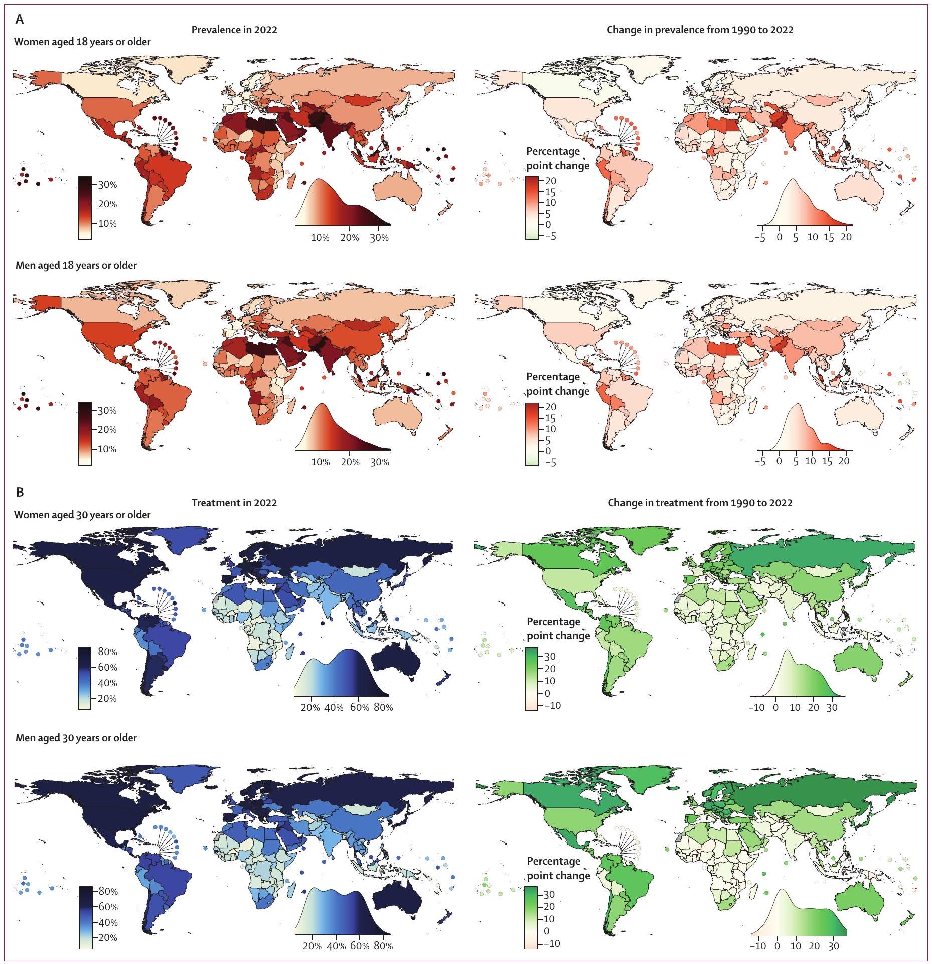 الشكل 2: انتشار مرض السكري المعدل حسب العمر ونسبة التغطية العلاجية في عام 2022 والتغير من 1990 إلى 2022 (أ) انتشار مرض السكري المعدل حسب العمر لدى الأشخاص الذين تتراوح أعمارهم بين 18 عامًا أو أكثر. (ب) تغطية العلاج المعدلة حسب العمر لدى الأشخاص الذين تتراوح أعمارهم بين 30 عامًا أو أكثر. يُظهر الرسم البياني الكثافي بجانب كل خريطة توزيع التقديرات عبر البلدان بشكل سلس. يُظهر الملحق (ص 78-81) الاحتمالية اللاحقة لزيادة أو نقصان مقدر أن يكون زيادة أو نقصان حقيقي. كما يُظهر الملحق (ص 92-93) النتائج لكلا الجنسين مجتمعة.