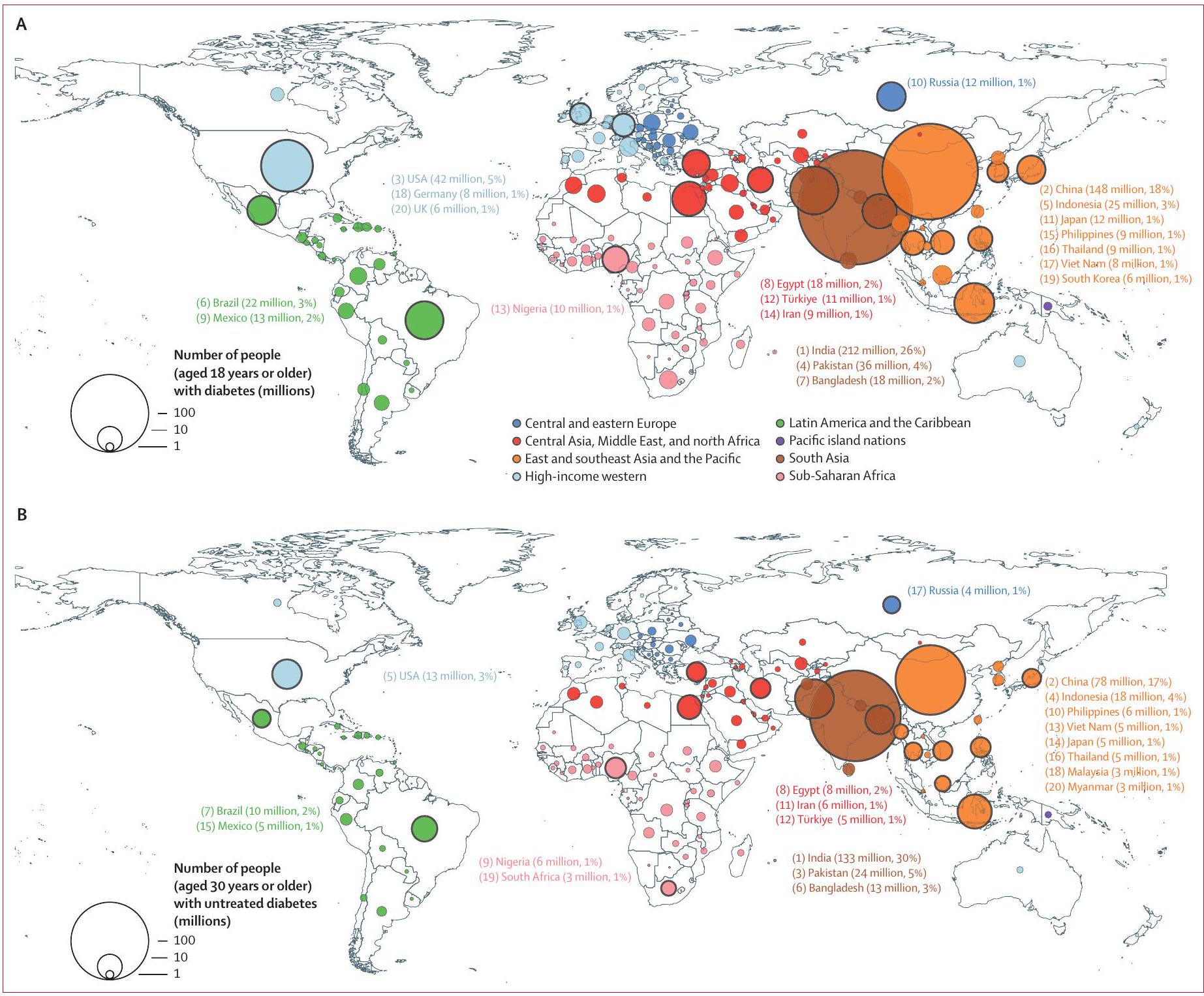 Figure 3: Number of people with (A) diabetes and (B) untreated diabetes in 2022