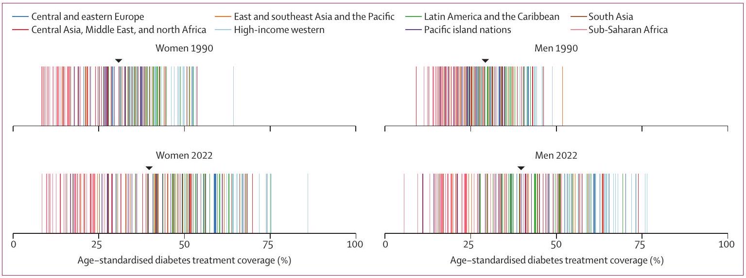 في عام 1990، كانت نسبة تغطية علاج السكري المعدلة حسب العمر أقل من في جميع الدول باستثناء 11 دولة للنساء ودولة واحدة للرجال. زادت نسبة تغطية العلاج المعدلة حسب العمر في 118 دولة (59%) للنساء و98 ( ) للرجال مع احتمال لاحق يزيد عن 0.80 من عام 1990 إلى 2022. تم ملاحظة بعض أكبر التحسينات (25-37 نقطة مئوية) في دول أمريكا اللاتينية (مثل المكسيك وكولومبيا وتشيلي وكوستاريكا والبرازيل)، وأوروبا الوسطى والغربية (مثل هولندا وفنلندا وكرواتيا)، وكندا وكوريا الجنوبية وروسيا وسيشيل والأردن لأحد الجنسين أو كليهما (الشكل 2). لم يتم الكشف عن زيادة أو نقصان في العلاج باحتمال لاحق قدره 0.80 في 82 دولة للنساء و101 للرجال، بما في ذلك معظم دول أفريقيا جنوب الصحراء الكبرى؛ ومنطقة الكاريبي؛ وجنوب وجنوب شرق وآسيا الوسطى؛ ودول جزر المحيط الهادئ. انخفضت نسبة تغطية العلاج قليلاً في الرجال في جامايكا مع احتمال لاحق يزيد عن 0.80.