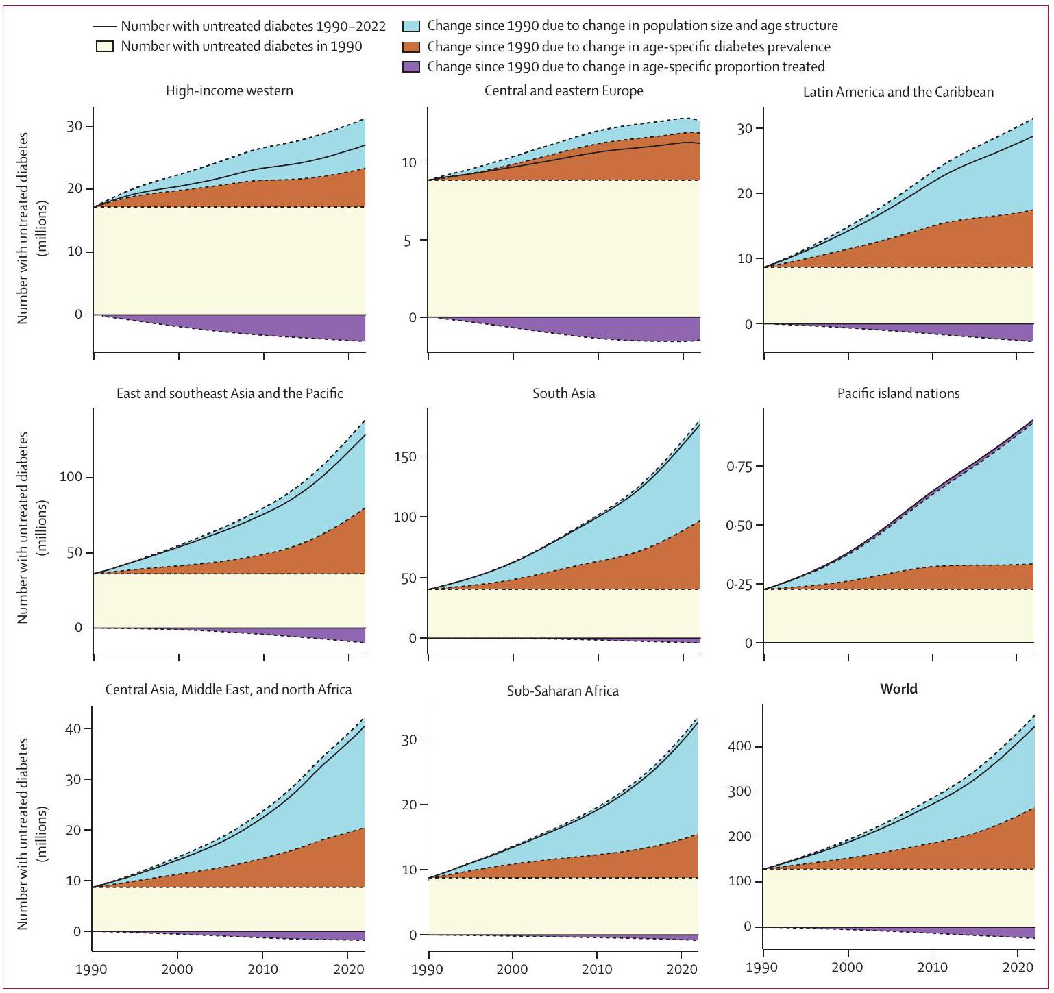 مجموع جميع الأقسام في كل رسم بياني هو العدد الإجمالي للأشخاص المصابين بالسكري غير المعالج على مر الزمن، كما هو موضح أيضًا بواسطة الخط الأسود الصلب. المساحة فوق الخط الأسود الصلب وأعلى الأقسام المكدسة، حيثما كانت موجودة، تساوي مساهمة تحسين العلاج (أي، القسم الأرجواني) نحو تقليل عدد الأشخاص المصابين بالسكري غير المعالج – أي، أعلى الأقسام المكدسة تظهر عدد الأشخاص الذين كان من الممكن أن يكون لديهم سكري غير معالج لو لم تتحسن نسبة تغطية العلاج. يصف الملحق (ص 69) الدول في كل منطقة كبرى.