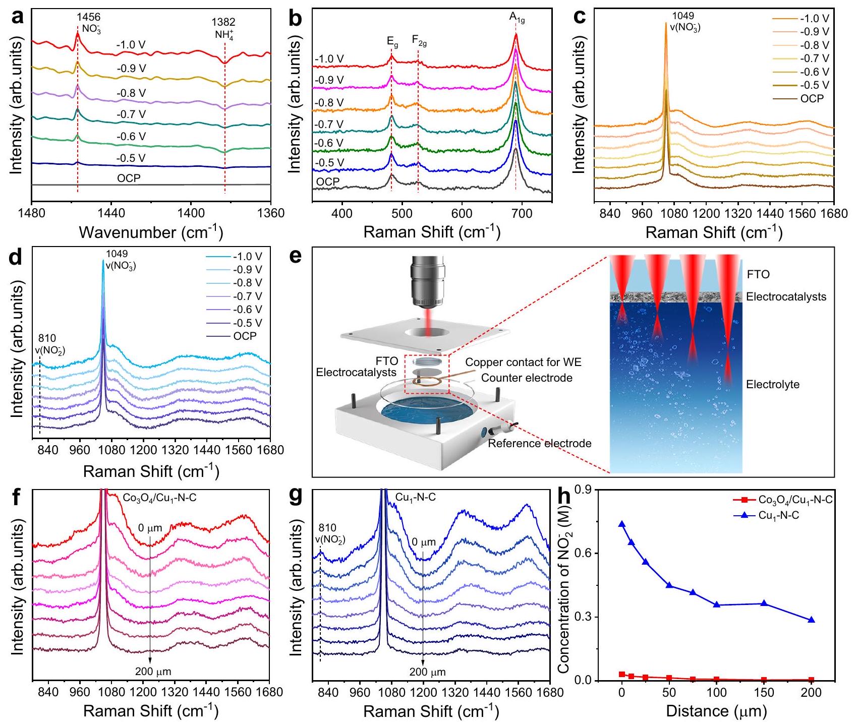 للحصول على مزيد من الفهم حول العملية التحفيزية لـالاختزال الكهربائي على-N-C، قمنا بإجراء مطيافية الأشعة تحت الحمراء التحويلية الكهروكيميائية (FTIR) ومطيافية رامان في الموقع لمراقبة عملية التفاعل (الأشكال التكميلية 36 و37). تعرض الشكل 3a أطياف FTIR في الموقع لـ عند الجهود المطبقة من OCP إلى -1.0 فولت مقابل RHE. القمم السلبية عند نُسِبَت إلى استهلاكنوع. بالإضافة إلى ذلك، ظهور قمم إيجابية تقع عندأكد أنتم إنشاؤه خلالالاختزال الكهربائي. بالإضافة إلى ذلك، هناك قمتان عند 1541 وتم الكشف عنها، والتي تم تخصيصها إلى نطاق الاهتزاز لـ *NO و *NOH، على التوالي (الشكل التوضيحي 38). يوضح الشكل 3b طيف رامان في الموقع لـفي جميع الجهود المطبقة. القمم التي تتوافق مع، و أنماط الاهتزازظل دون تغيير، مما يشير إلى أن كانت الأنواع مستقرة خلالالاختزال الكهربائي. خلال الـالاختزال الكهربائي، فقط القمة عندتمت ملاحظته لـفي جميع الجهود المطبقة، المخصصة للاهتزاز التمددي المتماثل لـ(الشكل 3ج). في حالة بصرف النظر عن إشارةذروة جديدة عند المنسوبة إلى اهتزاز الانحناء لـ ظهرت تدريجياً مع زيادة الجهد المطبق، مما يدل على تراكملـخلالالاختزال الكهربائي (الشكل 3د). لمزيد من التحقيق في تغير التركيز المحلي لـبالقرب من سطح المحفزات، صممنا خلية رامان تسمح لليزر رامان بالكشف من سطح المحفزات إلى كتلة الإلكتروليت. تم تصميم ليزر رامان ليكون متجهًا من خلف المحفزات لتقليل التداخل الناتج عن الامتصاص القوي لـفي الإلكتروليت. كما هو موضح في الشكل 3e، تم ترسيب المحفزات الكهربائية على زجاج مطلي بأكسيد القصدير الفلوري (FTO) كقطب عمل (WE). يتم التحكم في المسافة من شعاع الليزر إلى سطح القطب بواسطة منصة العينة الميكانيكية. تعرض الأشكال 3f و 3g طيف رامان في الموقع لـ و عند -0.8 فولت مقابل RHE عندما تم وضع شعاع الليزر من 0 إلىبعيدًا عن سطح المحفزات، على التوالي. مع زيادة المسافة بين المستوى البؤري لليزر وسطح المحفزات، انخفضت شدة إشارة الكربون الجرافيتي للمحفزات تدريجيًا. قمة ملحوظة عندمُعين إلىظهر بالقرب من سطح. بينما، إشارة لـكان ضئيلاً,