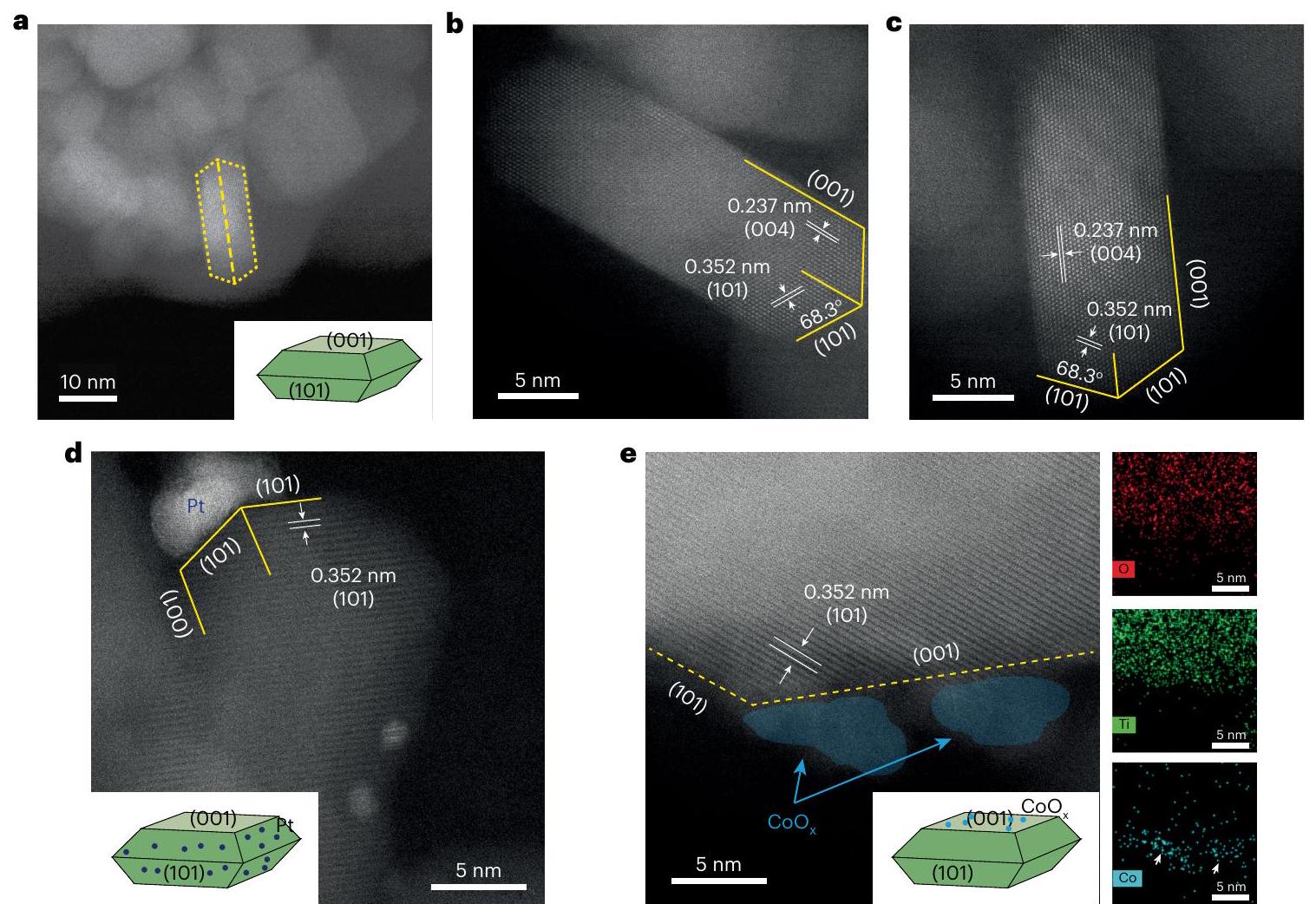 الشكل 2أ-ج يعرض صور HAADF-STEM لأناتاز محكم الأوجهالهياكل النانوية. تم تقدير نسب الأسطح المكشوفة (101) و (001) لتكونو60%، على التوالي، وفقًا لبناء وولف. نقطة أوتم تحميلها علىمن خلال الترسيب الضوئي الانتقائي للسطح لمركباتهم القابلة للذوبان من Pt (II) أو Co (II) على التواليلقد تم إثبات أنه عند تعرضه للإشعاع الضوئي، تهاجر الإلكترونات/الثقوب المثارة ضوئياً إلى أسطح جزيئات أشباه الموصلات وتقوم بتقليل/أكسدة المواد الأولية القابلة للذوبان في المحلول، مكونة ترسيباتلذلك، يمكن أن تعمل هذه الجسيمات النانوية كمؤشرات للإلكترونات والفجوات التي تتولد ضوئياً والموجودة على أسطح هذه المحفزات. صور STEM، إلى جانب الطاقة