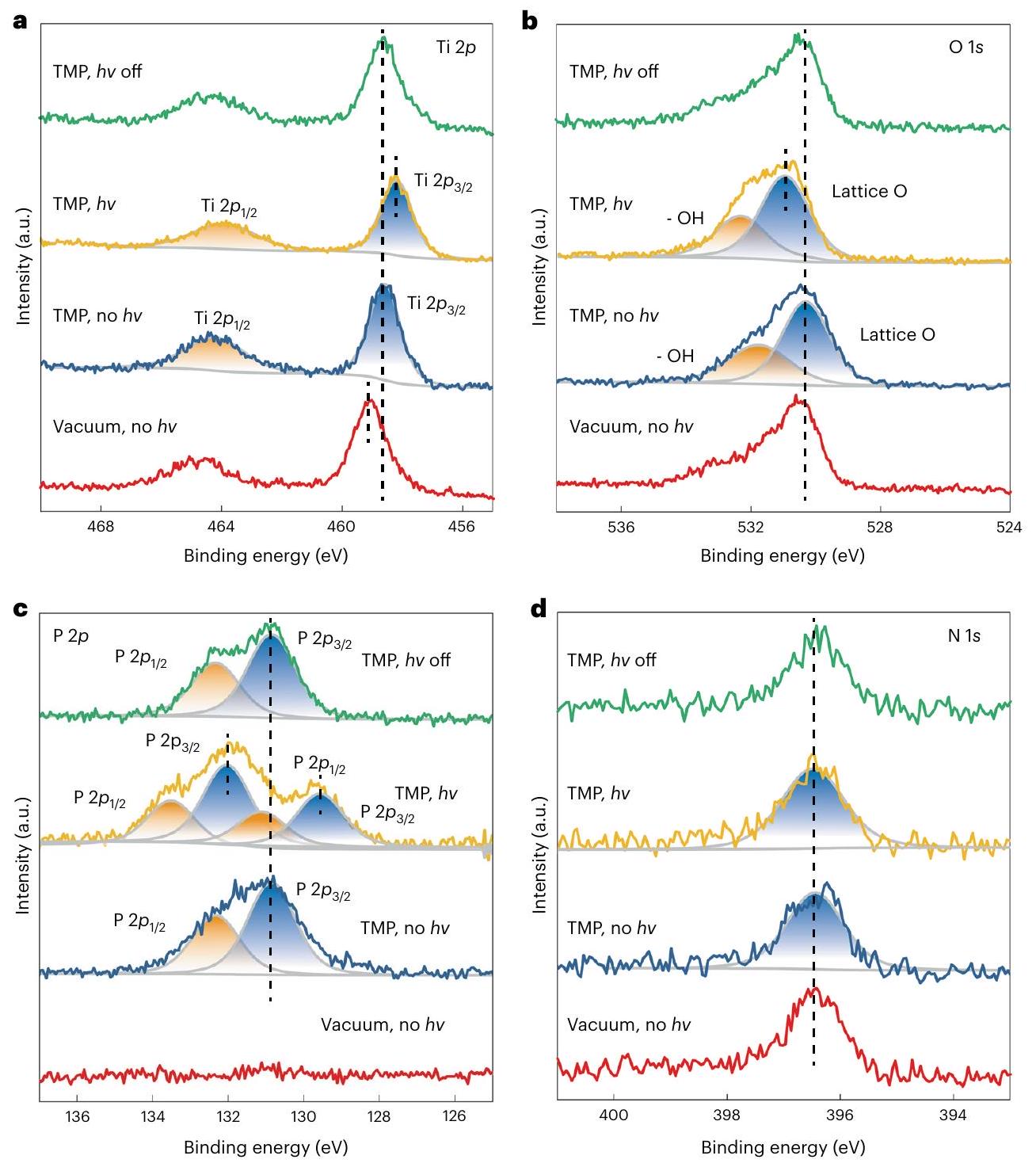 تم إجراء دراسات AP-XPS فيللتحقيق في الخصائص الإلكترونية السطحية لـباستخدام ثلاثي ميثيل الفسفين (TMP) كمسبار سطحي (ملاحظة تكميلية 3). عندما يتم امتصاص TMP على ، الالإشارة تتحول إلى طاقة ارتباط أقل (BE؛ الشكل 3أ)، لأن TMP هو قاعدة لويس، مما يجعل السطحغني بالإلكترونات من خلال تكوين مركبات إضافية، بينمايبقى الإشارة كما هي (الشكل 3ب). تحت إضاءة LED البيضاء، الــينتقل الإشارة قليلاً إلى طاقة ارتباط أقل وإشارة O 1s إلى طاقة ارتباط أعلى (الشكل 3أ، ب، الخطوط الصفراء)، وفقًا للأدبيات، لأن الإلكترونات تتحفز من نطاق التكافؤ الذي يهيمن عليه الأكسجين إلى نطاق التوصيل الذي يهيمن عليه التيتانيوم. تعود هذه التحولات في هذه الإشارات عند إيقاف الضوء، مما يشير إلى أن تحولات طاقة الربط ناتجة عن التحفيز الضوئي وليس بسبب أي تلف في العينة أو إعادة بناء سطحية غير قابلة للعكس. يجب ملاحظة أن التيتانيوموطيف O1s يشمل كل من الإلكترونيات السطحية والداخلية