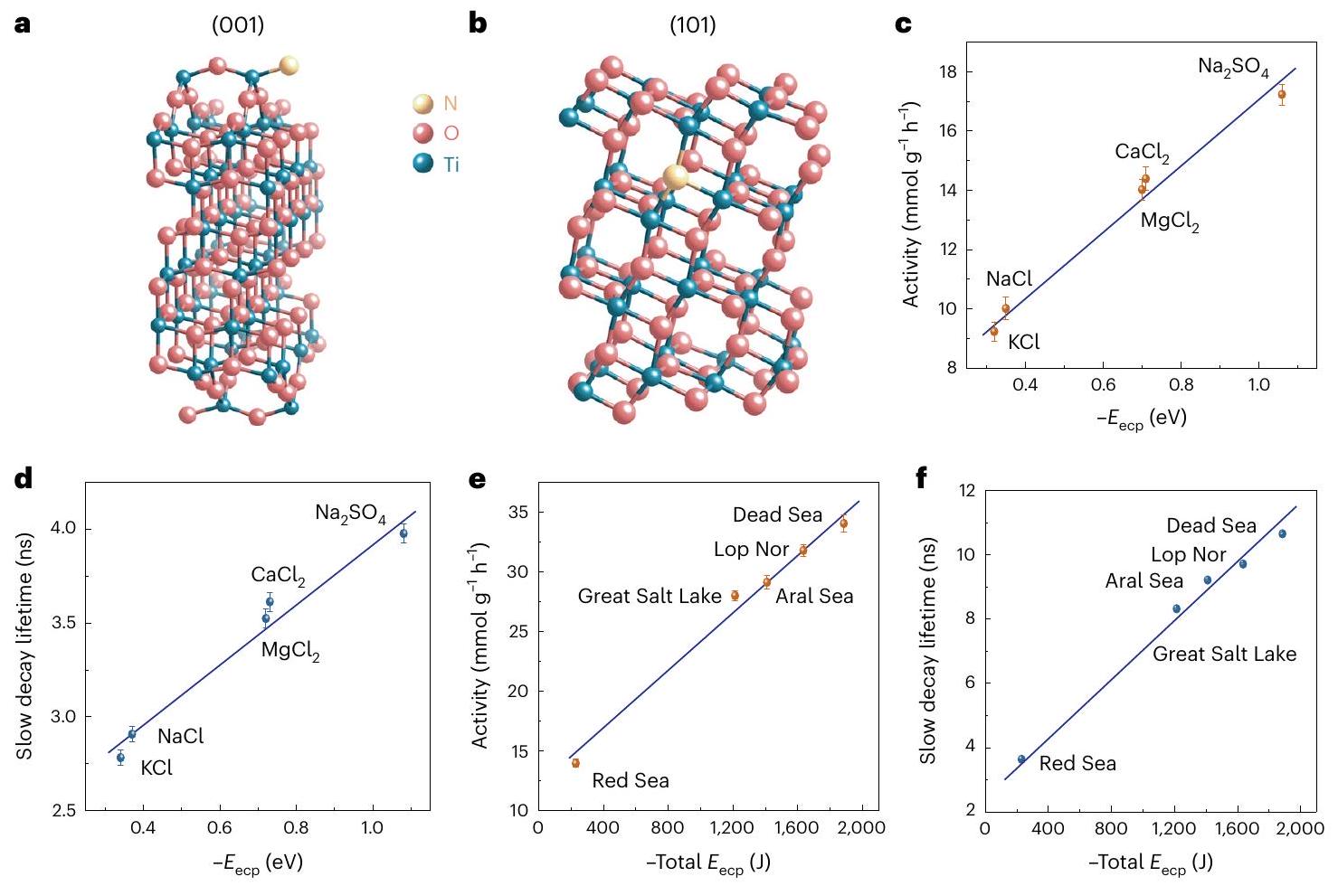 ج، د، الارتباطات بين نشاط POWS (ج) وعمر مكون التلاشي البطيء (د) مع الحساباتلأيونات مختلفة. هـ، و، العلاقات بين نشاط POWS (هـ) وعمر مكون التحلل البطيء (و) مع الإجمالي المحسوبلأنواع مختلفة من المياه البحرية الاصطناعية. النقاط المركزية للبيانات هي متوسط ثلاث قياسات مستقلة (). تمثل أشرطة الخطأ الانحراف المعياري. تفاصيل الـتم توفير الحسابات في الجدول التكميلي 8. موقع التيتانيوم رباعي التنسيق في المادة المخدومة بالنيتروجينالسطح (الشكل التوضيحي التكميلي 19). النتائج لـوالامتصاص ينطبق أيضًا على الكاتيونات والأنيونات الأخرى (الأشكال التكميلية 20-25). تم توفير إحداثيات الأنظمة المدروسة كبيانات تكميلية 1. طاقة الامتصاص () يمكن حساب تركيز الإلكتروليت عن طريق جمع طاقات الامتزاز للأنيون والكتيون المقابلين. يتم إضافة الفجوات والإلكترونات إلى نماذج السطح عمدًا لمحاكاة استقطاب الشحنة عند الإثارة. من الواضح أن شدة تأثير استقطاب الشحنة الناتج عن الإلكتروليتات يمكن تقييمها من خلال التغير في الـ من الإلكتروليتات عند الإثارة، والمعرفة هنا على أنها طاقة استقطاب الشحنة بمساعدة الإلكتروليت (). المحسوبتُظهر القيم أن جميع الإلكتروليتات المدروسة يمكن أن تمارس تأثير استقطاب شحني بدرجات مختلفة، اعتمادًا على نصف القطر الأيوني والشحنة، لأن طبيعة هذا التأثير هي التفاعل الكهروستاتيكي بين حاملي الشحنة (الجدول التكميلي 8). طاقات التفاعل الكهروستاتيكي بين الأيونات والمُدخَل النيتروجيني الذي يمكنه احتجاز حاملي الشحنة، أي الإلكترونات على (101) أو الفجوات على (001)-()، تم حسابها. كانت فروق طاقة التفاعل الكهروستاتيكي للأنظمة المشحونة والمحايدة المقابلة جميعها سالبة وتعتمد على حالة التكافؤ للأيونات (الجدول التكميلي 9)، وهو ما يتوافق مع طاقات استقطاب الشحنة الناتجة عن الأيونات المحسوبة (الجدول التكميلي 8). كما قمنا بحساب مخططات فرق كثافة الشحنة لامتصاص الأيونات على المادة المدوّنة بالنيتروجينوالمُشَبع بالنيتروجينالأسطح. تُظهر الرسوم البيانية انتقال الشحنة بين الأيونات والأسطح، ويكون انتقال الشحنة في نظام مشحون عادةً أكثر وضوحًا من ذلك في نظام متعادل الشحنة (الأشكال التكميلية 26-31)، وهو ما يتوافق مع شحنات بادر المحسوبة وفروق كثافة الدوران. تشير كل هذه النتائج بوضوح إلى التفاعل المتبادل الاستقرار بين حاملي الشحنة والأيونات. بعبارة أخرى، يؤدي تأثير استقطاب الشحنة إلى تراكم الكاتيونات والأنيونات على السطوح (101) و(001) على التوالي، وتعمل الأيونات الممتزة بدورها على تعزيز استقطاب الشحنة بشكل أكبر. توضح الشكلين 4ج، 4د أنه مع ازدياد تأثير الاستقطاب (أي، أن تصبح أكثر سلبية)، يتم إطالة عمر حاملي الشحنة بشكل كبير، مما يؤدي إلى تعزيز نشاط POWS، وتُلاحظ علاقات خطية. في حالة المياه البحرية الاصطناعية، يظهر كل من نشاط POWS وعمر حاملي الشحنة، مرة أخرى، علاقات خطية مع(الشكل 4هـ، و). لا شك أن التفاعل القوي بين الأنواع الأيونية والأسطح المستقطبة يلعب دورًا هامًا في نظام POWS لدينا عند درجات الحرارة المرتفعة، مما يسهل احتجاز الشحنات المولدة ضوئيًا على السطح، مما يؤدي إلى إطالة عمر الشحنات (وهو ما تدعمه أيضًا تقنية TRPL في الشكل 1). بالإضافة إلى ذلك، تظهر النشاط علاقة خطية إيجابية مع عمر الشحنات (الشكل 5أ، ب). يسمح العمر الممتد للمزيد من الشحنات بالتفاعل معويروج لـ و التطورات، مما يؤدي إلى تعزيز نشاط أسرى الحرب.