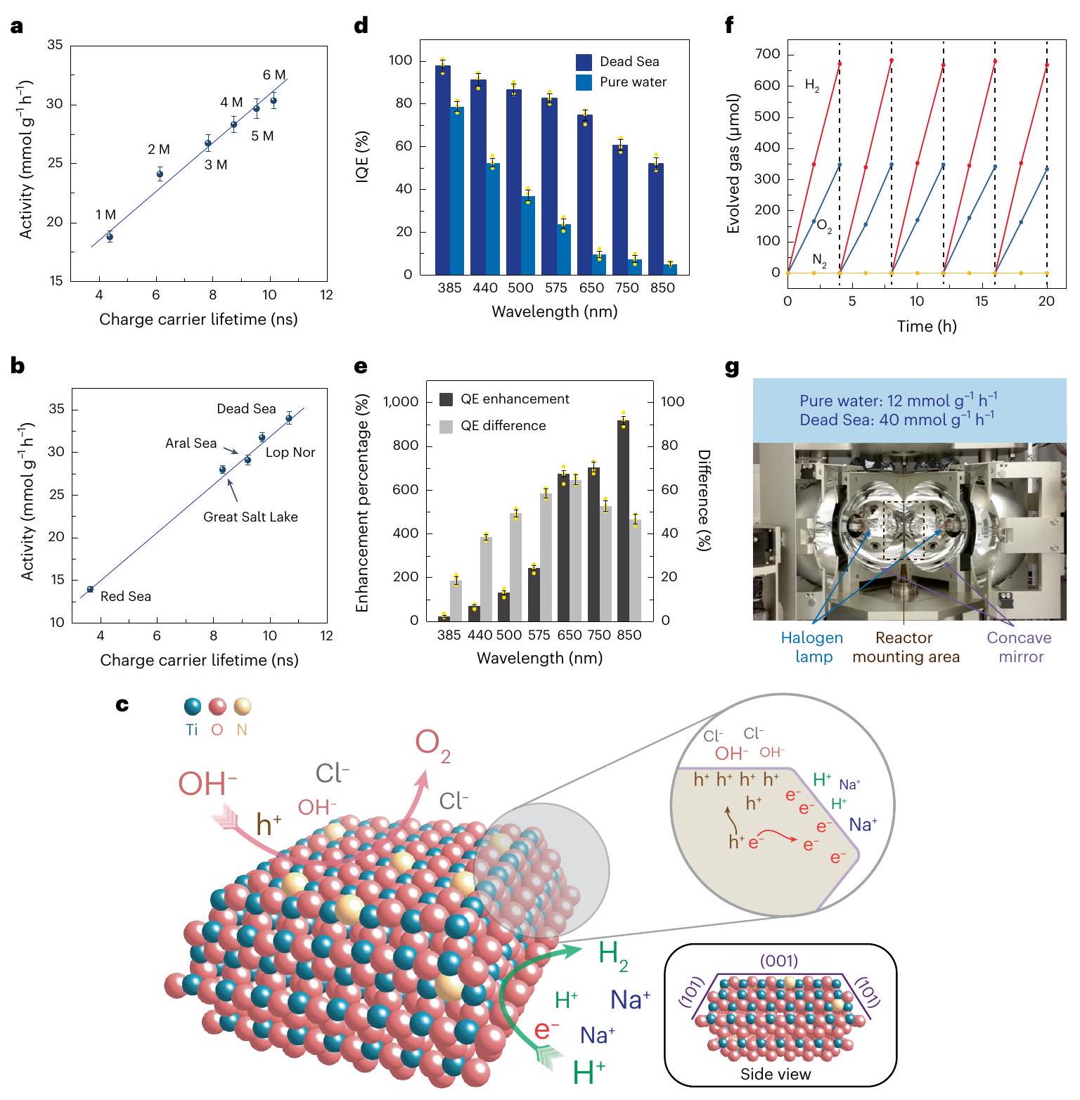 الشكل 5| أداء تفاعل POWS بمساعدة الإلكتروليت. a,b، العلاقة بين نشاط POWS وعمر حاملي الشحنة المتولدة ضوئياً في محاليل NaCl (a) والمياه البحرية الصناعية (b). M تمثل المولارية. c، توضيح تخطيطي لاستقطاب الشحنة بمساعدة الإلكتروليت بين الوجوه المختلفة للوجه المسيطر عليهفي ماء البحر عند الإثارة الضوئية. لم يتم الإشارة إلى إعادة بناء الأسطح (001) من أجل التبسيط، ولكن تم إثباتها بواسطة حسابات DFT. وفقًا لنتائج HAADF-STEM وAP-XPS وDFT، يحدث استقطاب السطح عند الإثارة الضوئية، مما يسهل امتصاص الكاتيونات على الوجوه المكشوفة (101) والأنيونات على الوجوه (001). هذا الامتصاص السطحي المُيسر، بدوره، يجذب الإلكترونات والفجوات بواسطة القوة الكهروستاتيكية، مما يثبط إعادة اتحاد الشحنات ويطيل عمر حاملي الشحنة. د، تقييمات QE لـفي الماء النقي وماء البحر الميت الصناعي عند مستويات مختلفة الأطوال الموجية عند . تشير أشرطة الخطأ إلى الانحراف المعياري. تم تحقيق متوسط كفاءة كمية عالية عبر كامل نطاق الضوء المرئي في ماء البحر الميت الصناعي، دون الانخفاض الحاد النموذجي عند الأطوال الموجية الطويلة. هـ، نسبة تحسين الكفاءة الداخلية الكميةوفارق IQE () لأطوال موجية مختلفة عند ، مشتق من d.f، اختبار استقرار دورة الخمسفي ماء البحر الميت الاصطناعي. ج، فرن مركز للضوء يحاكي فرنًا شمسيًا لتوفير الحرارة والضوء دون إدخال طاقة من أجهزة التدفئة الكهربائية الأخرى، مما يظهر نشاطًا معززًا لـأكثر من 20 ساعة، وهو ما يعادلمعدل التطور لـعند درجة الحرارة والضغط القياسيين، مع العلم أن المنطقة المضاءة كانتوتم استخدام 20 ملغ من المحفز الضوئي في هذه التجربة. في هذا الشكل، تشير جميع أشرطة الخطأ إلى الانحراف المعياري، ونقاط البيانات المركزية لأشرطة الخطأ هي متوسط ثلاث قياسات مستقلة (). النقاط الصفراء تمثل نقاط البيانات.