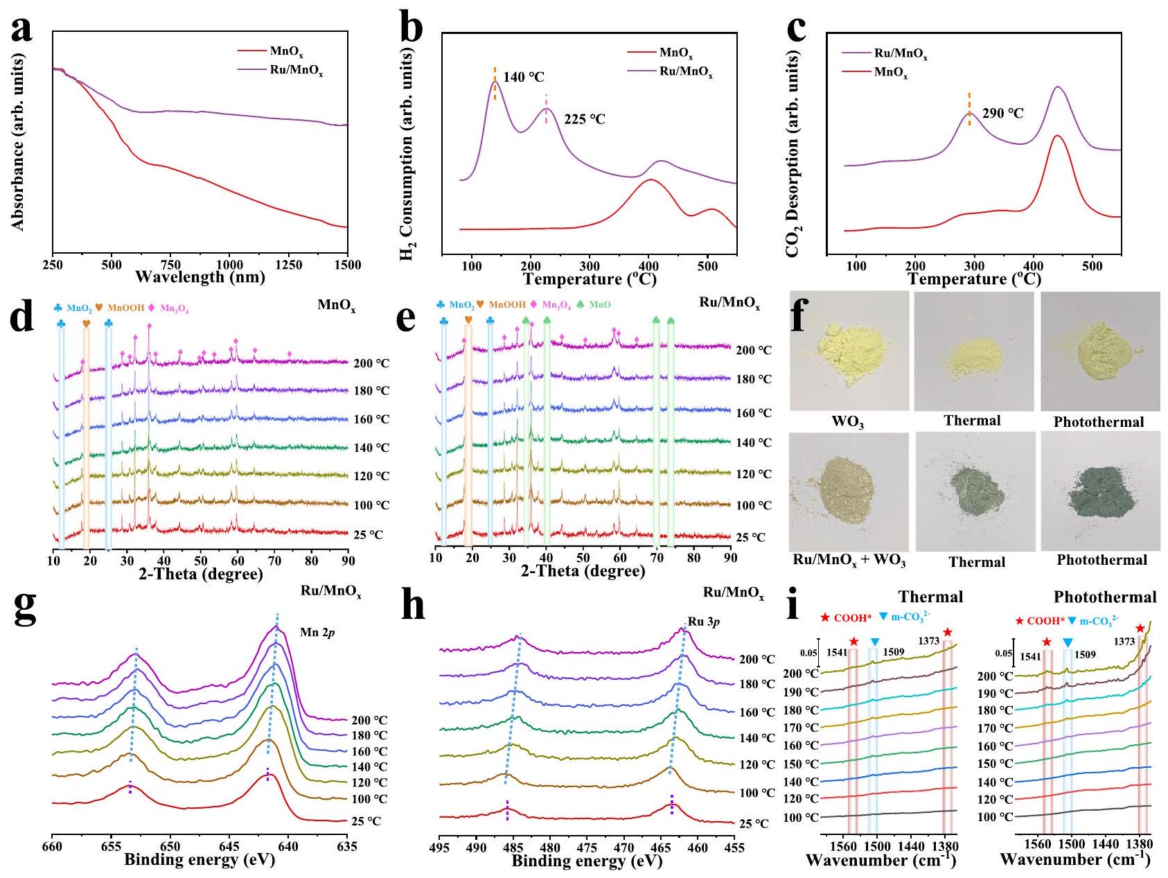تمت دراسة مورفولوجيا العينات باستخدام مجهر إلكتروني مسح ضوئي من نوع Zeiss Sigma HD ومجهر إلكتروني نافذ من نوع JEOL JEM-2100F. تم تشغيل مجهر الإلكترون الناقل ذو الحقل المظلم الحلقي بزاوية عالية بواسطة EMARM300F. تم استخدام جهاز Rigaku Ultima VI للأشعة السينية لتسجيل أنماط حيود الأشعة السينية بسرعة مسحبين و الذي تم تشغيله عند 25 كيلو فولت و 35 مللي أمبير معالإشعاع. تم إجراء قياسات XPS على مطياف الإلكترونات AXIS Supraالإشعاع. تم إجراء قياسات BET بواسطةفيفي جهاز Quadrasorb evo. تم إجراء مطيافية تحويل فورييه للأشعة تحت الحمراء باستخدام جهاز Nicolet NEXUS670. تم الحصول على طيف الانعكاس المنتشر للأشعة فوق البنفسجية والأشعة المرئية والأشعة تحت الحمراء القريبة بواسطة مطياف الأشعة فوق البنفسجية والأشعة المرئية والأشعة تحت الحمراء القريبة (UV3600 Plus، شيمادزو، اليابان). تم إجراء تحليل رامان باستخدام مطياف رامان الذكي Thermo Scientific DXR2 مع ليزر بقدرة 532 نانومتر. تمثل إيزوثيرم الامتصاص لـتم تحديدها عند 273 كلفن باستخدام جهاز BELSORP-max II. تم استخدام مطياف جهاز متصل بالشحن مبرد بالنيتروجين السائل (Princeton Instruments) وأنبوب مضاعف الفوتونات مع لوحة قنوات دقيقة (Hamamatsu) مع تقنية العد الفردي للفوتونات المرتبطة زمنياً (Edinburgh Instruments) لقياس العد والفترات الزمنية تحت إثارة 375 نانومتر. تم تحديد محتويات الروثينيوم بواسطة مطياف انبعاث البلازما المقترن بالحث (ICP-OES) على جهاز Optima 8300.-تم قياس TPR على جهاز تحليل الكيمياء السطحية Micromeritics AutoChem II مع كاشف TCD، وتم تسخين العينة إلىفيفي تدفقه ) ثم تم تبريده إلى . بعد ذلك، تم تسخين العينة إلىفيفيتدفق مختلطتم الكشف عن الغازات المنبعثة من الجو بواسطة جهاز TCD.-تم قياس TPD على جهاز تحليل الكيمياء السطحية Micromeritics AutoChem II مع كاشف TCD. تم تسخين العينة إلىفيفي تدفقه ) ثم تم تبريده إلى . التالي، تدفق مختلطتم إدخالها إلى سرير المحفز لمدة 0.5 ساعة. ثم تعرضت العينة لـلمدة 0.5 ساعة لإزالة المواد الم adsorbed الضعيفةمن السطح. أخيرًا، تم تسخين العينة إلىفيفي جو من الهيليوم وتم الكشف عن الغاز الخارج بواسطة TCD. تم تسجيل درجة حرارة العينات بواسطة كاميرا تصوير حراري بالأشعة تحت الحمراء (Fotrfic 315، شركة شنغهاي للتكنولوجيا الحرارية المحدودة). بالنظر إلى القدرة المحدودة لنافذة المفاعل المكونة من أكسيد الألومنيوم على الاختراقالضوء تحت الأحمر، تلتقط الصورة درجة الحرارة الداخلية للريكتور عن طريق إزالة نافذة الريكتور بسرعة. تم جمع قياسات XRD بدرجات حرارة متغيرة بواسطة أنماط حيود الأشعة السينية (D8 Advance). تم تسخين العينات فيتدفق مختلط ) من إلىجمع البيانات بعد الحفاظ على درجة الحرارة المحددة لمدة 5 دقائق. تم إجراء قياسات XPS تحت درجات حرارة متغيرة على مطياف الإلكترونات Thermo EXCALAB 250Xi باستخدام الألمنيوم.الإشعاع. تم تثبيت المحفزات على حامل العينة وتم تنشيطها بالإضاءة في غرفة المعالجة المسبقة تحتتدفق مختلط ) من إلى. ثم تم إدخال العينة في غرفة الفراغ العالي جدًا لقياس XPS عند درجة حرارة الغرفة بعد الحفاظ على درجة الحرارة المحددة لمدة 5 دقائق. تم تسجيل طيف FT-IR تحت درجات حرارة متغيرة باستخدام مطياف FTIR NICOLET iS50 (ثيرمو ساينتيفيك، الولايات المتحدة الأمريكية) المزود بغرفة تفاعل عالية الحرارة وكاشف من كادميوم الزئبق التيلوريوم (MCT) بدقة و32 مسحًا لكل طيف. تم مسح الطيف الخلفي بعد غاز الخليط ( ) تم تقديمه. تم إجراء تحليلات TG-MS على جهاز تحليل الوزن الحراري (NETZSCH STA449 F3QMS403D) تحت الهواء. تم تثبيت المحفزات على حامل العينة وتم إغلاق المفاعل حتى تم استبدال الهواء الموجود فيه بـتدفق مختلطبعد ذلك تم تسجيل طيف الخلفية. عند الوصول إلى درجة الحرارة المطلوبة من خلال التسخين الخارجي والإشعاع المتزامن، تم الحفاظ على النظام لمدة 5 دقائق. بعد ذلك، تمت إزالة مصدر الضوء لقياس FT-IR. تم قياس سمك طبقة المحفز في المفاعل الدفعي بواسطة المجهر الضوئي الماسح بالليزر LEXT OLS5100.