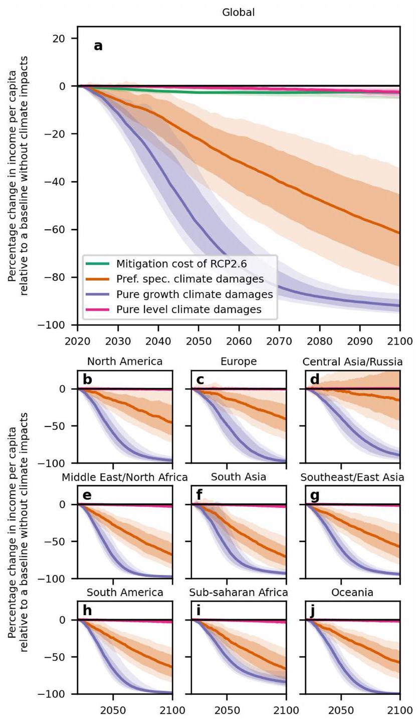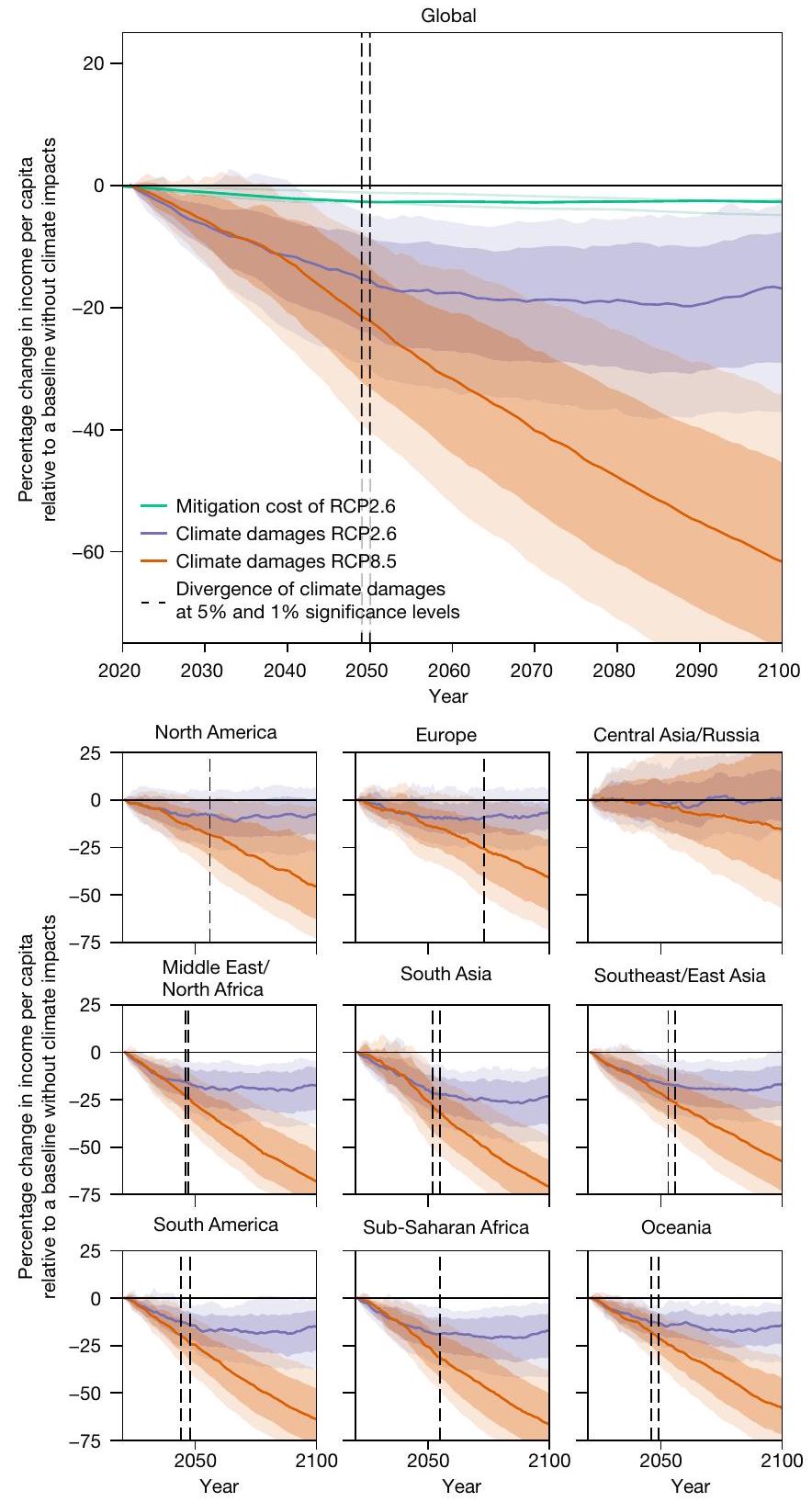 عادةً ما تجد تحليلات التكلفة والفائدة أن الفوائد الصافية للتخفيف تظهر فقط بعد عام 2050 (المرجع 5)، مما قد يقود البعض إلى الاستنتاج بأن الأضرار المادية الناتجة عن تغير المناخ ليست كبيرة بما يكفي لتفوق تكاليف التخفيف حتى النصف الثاني من القرن. توضح مقارنتنا البسيطة لحجمها أن الأضرار أكبر بالفعل بكثير من تكاليف التخفيف وأن ظهور الفوائد الصافية للتخفيف المتأخرة ناتج بشكل أساسي عن حقيقة أن الأضرار عبر مسارات الانبعاثات المختلفة لا يمكن تمييزها حتى منتصف القرن (الشكل 1).