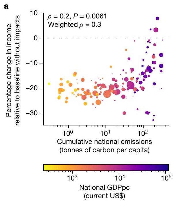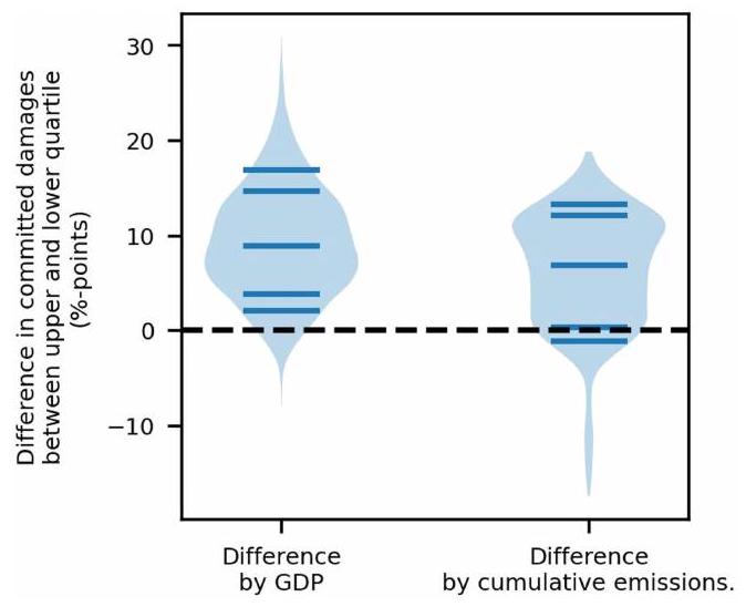 تصنيف الاحتمالية المعتمد من قبل الهيئة الحكومية الدولية المعنية بتغير المناخ). وبالمثل، فإن الربع من الدول التي لديها انبعاثات تراكمية تاريخية أقل ملتزم بخسارة في الدخل تبلغ 6.9 نقطة مئوية (أو
