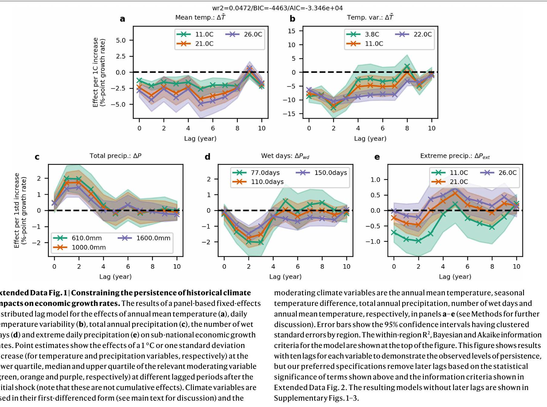 نبدأ تحليلنا التجريبي لاستمرارية تأثيرات المناخ على النمو باستخدام عشرة تأخيرات من المتغيرات المناخية ذات الفرق الأول في نماذج التأخير الموزعة ذات التأثيرات الثابتة. نكتشف تأثيرات كبيرة على النمو الاقتصادي في تأخيرات زمنية تصل إلى حوالي 8-10 سنوات بالنسبة لمصطلحات درجة الحرارة وحوالي 4 سنوات لمصطلحات الهطول (الشكل 1 من البيانات الموسعة والجدول 2 من البيانات الموسعة). علاوة على ذلك، تشير التقييمات من خلال معايير المعلومات إلى أن تضمين جميع المتغيرات المناخية الخمسة واستخدام هذه الأعداد من التأخيرات يوفر توازناً مفضلاً بين أفضل ملاءمة للبيانات وتضمين مصطلحات إضافية قد تسبب الإفراط في التخصيص، مقارنة بمواصفات النماذج التي تستبعد المتغيرات المناخية أو تتضمن المزيد أو القليل من التأخيرات (الشكل 3 من البيانات الموسعة، قسم الطرق التكميلية 1 والجدول 1 من البيانات التكميلية). لذلك، نقوم بإزالة المصطلحات غير المهمة إحصائياً في التأخيرات اللاحقة (الأشكال التكميلية 1-3 والجدول 2-4 من البيانات التكميلية). تظهر اختبارات إضافية باستخدام محاكاة مونت كارلو أن النماذج التجريبية قوية أمام الارتباط الذاتي في المتغيرات المناخية المتأخرة (قسم الطرق التكميلية 2 والأشكال التكميلية 4 و5)، وأن معايير المعلومات توفر مؤشراً فعالاً لاختيار التأخير (قسم الطرق التكميلية 2 والشكل التكميلية 6)، وأن النتائج قوية أمام مخاوف التعدد الخطي غير المثالي بين المتغيرات المناخية وأن تضمين عدة متغيرات مناخية ضروري فعلاً لعزل تأثيراتها المنفصلة (قسم الطرق التكميلية 3 والشكل التكميلية 7).