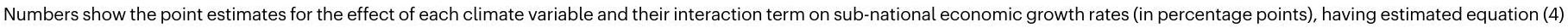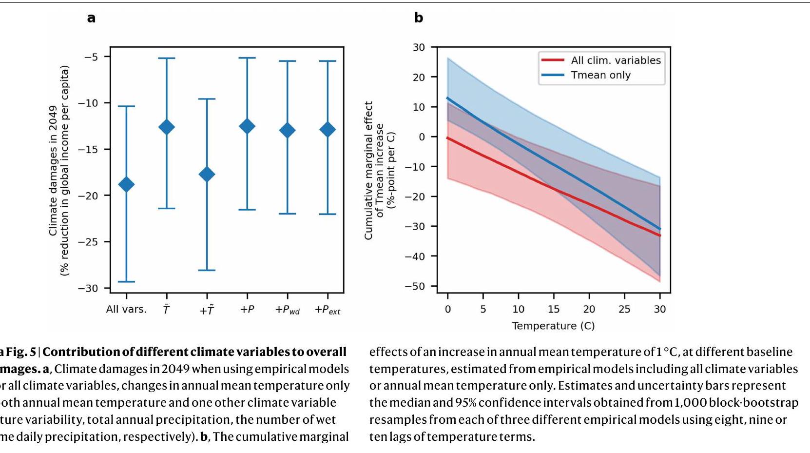 (الشكل 5 من البيانات الموسعة أ، النطاق المحتمل 5-21%). وهذا يشير إلى أن الأخذ في الاعتبار المكونات الأخرى لتوزيع درجة الحرارة وهطول الأمطار يزيد الأضرار الصافية بنحو 50%. ينشأ هذا الارتفاع من الأضرار الإضافية التي تسببها هذه المكونات المناخية، ولكن أيضًا لأن إدراجها يكشف عن استجابة اقتصادية سلبية أقوى لدرجات الحرارة المتوسطة (الشكل 5 من البيانات الموسعة ب). يتماشى هذا الاكتشاف مع محاكاة مونت كارلو لدينا، التي تشير إلى أن حجم تأثير درجة الحرارة المتوسطة على النمو الاقتصادي يتم التقليل من قيمته ما لم يتم الأخذ في الاعتبار تأثيرات المتغيرات المناخية الأخرى المرتبطة (الشكل التكميلية 7).