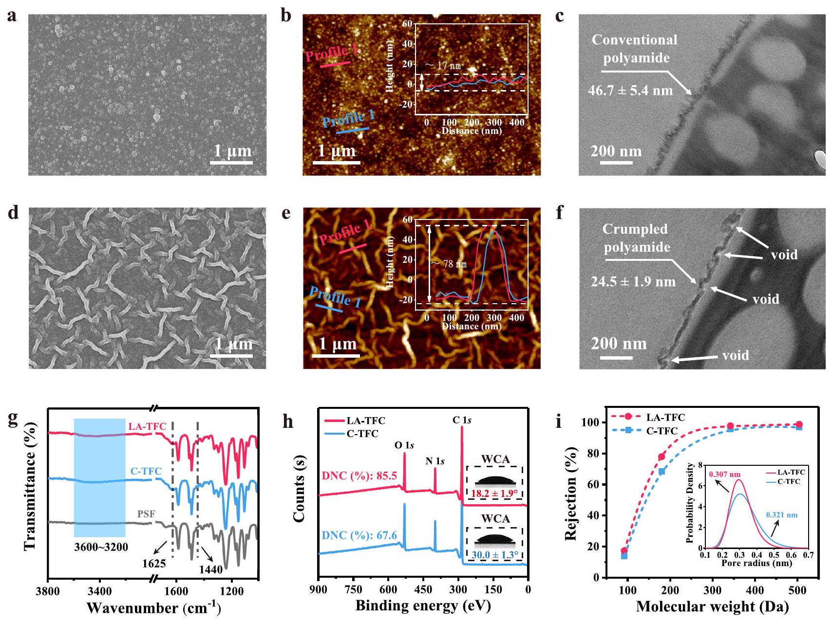 membranes. Inserts in (b, e) are height profiles of the corresponding PA nanofilms, inserts in (h) are degree of network cross-linking (DNC) and water contact angles (WCAs) of C-TFC and LA-TFC membranes, and inserts in (i) are pore size distributions of C-TFC and LA-TFC membranes, respectively. The concentration of LA for LA-TFC membrane preparation was .