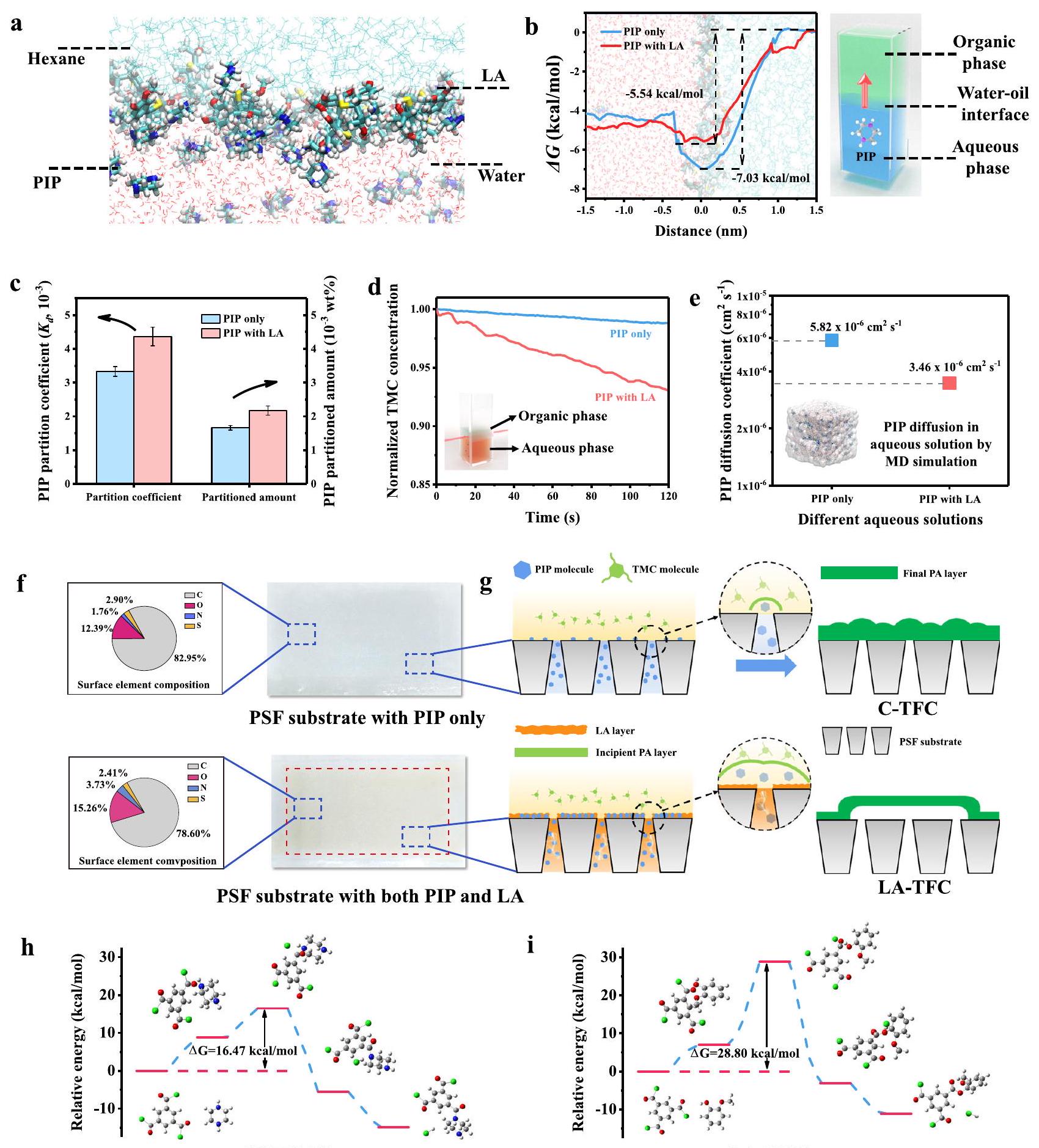 تركيز TMC هو ). e معدل انتشار PIP في محلول الطور المائي الكتلي بواسطة محاكاة الديناميكا الجزيئية (الإدراج يمثل صندوق المحاكاة). f تركيبات عناصر السطح وصور بصرية لركائز بولي سلفون (PSF) مع PIP فقط ومع كل من PIP و LA الممتصة.المخططات التخطيطية لتكوين أغشية التحكم-TFC (C-TFC) وLA-TFC مع طبقة بولياميد (PA) ذات مورفولوجيا مختلفة. و تغيرات الطاقة الحرة للتفاعلات بين مجموعة كلوريد الأسيل في TMC ومجموعة الأمين في PIP/مجموعة الهيدروكسيل الفينولية في LA، على التوالي (تم حذف السلسلة الألكيلية في جزيء LA للسماح بتقارب الهيكل خلال عملية الحساب). تمثل أشرطة الخطأ الانحراف المعياري لثلاث قياسات مستقلة.