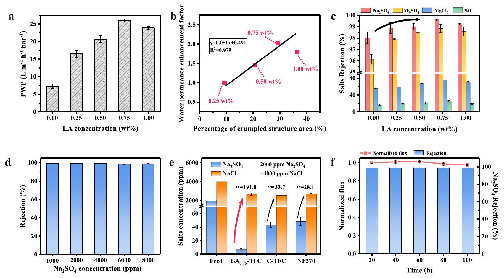 Fig. 4 | Separation performance of different thin film composite (TFC) membranes. a Effects of lignin alkali (LA) concentrations on pure water permeance (PWP) of LA-TFC membranes. The correlation between water permeance enhancement factor and percentage of crumpled structure area of LA-TFC membranes. c Effects of LA concentrations on different salts rejections of LA-TFC