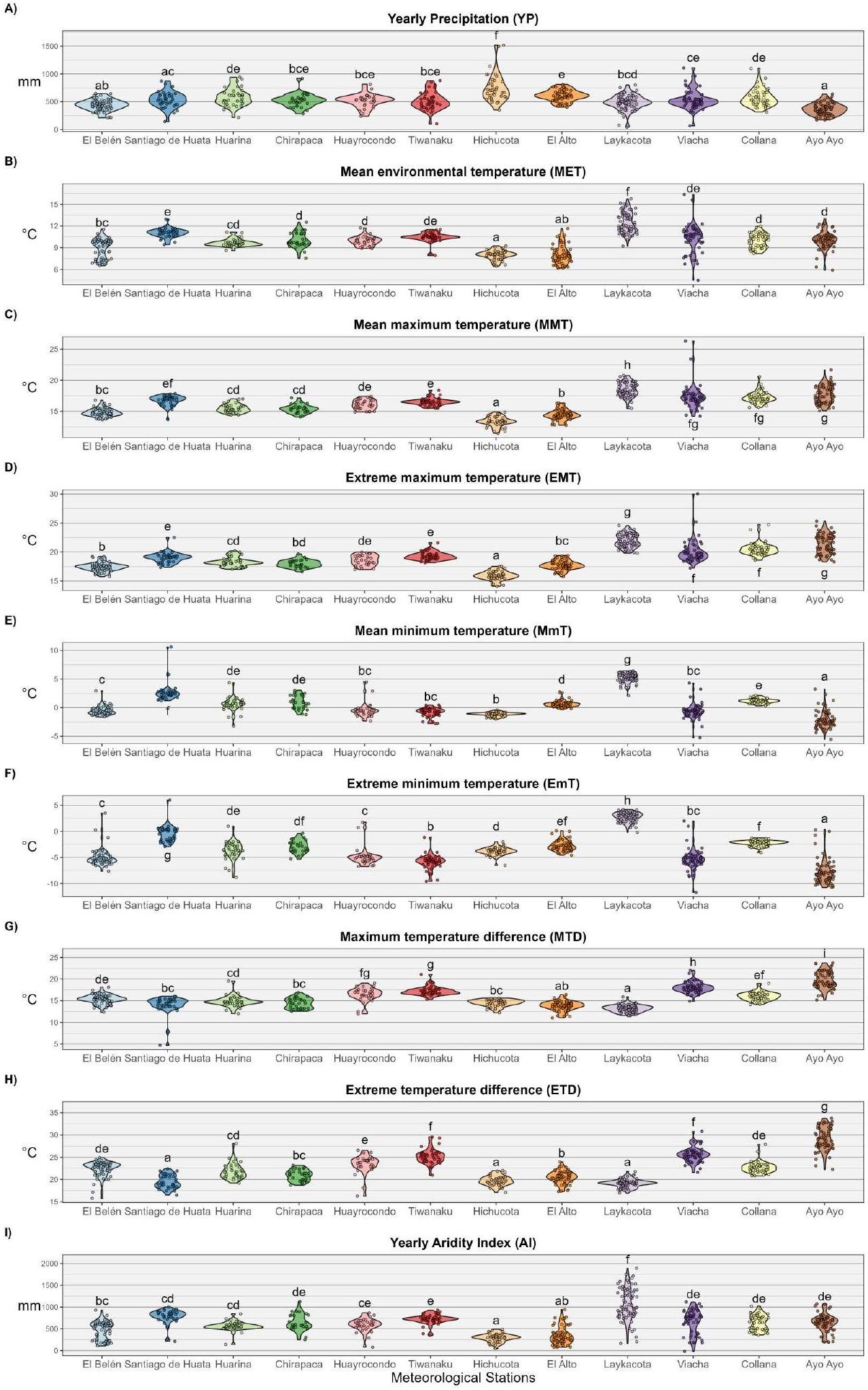 | Variable | Hichucota (1979-2020) | El Alto (1962-2020) | Laykacota (1945-2020) | Viacha (1965-2015) | Collana (1973-2020) | Ayo Ayo (1958-2020) |