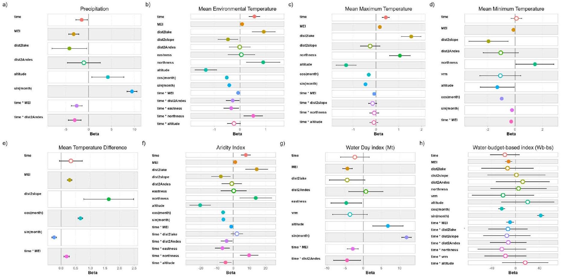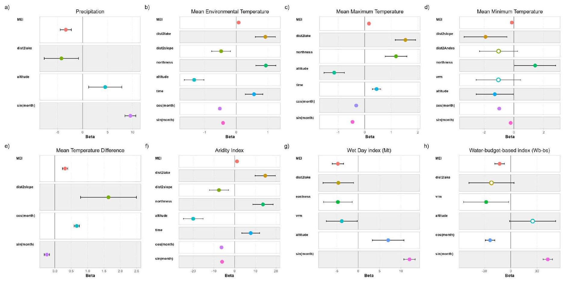 Model A: response variable $sim$ MEI + dist2lake + dist2contour + dist2Andes + eastness + northness + VRM + altitude + time $+cos ($ month $)+sin ($ month $)$