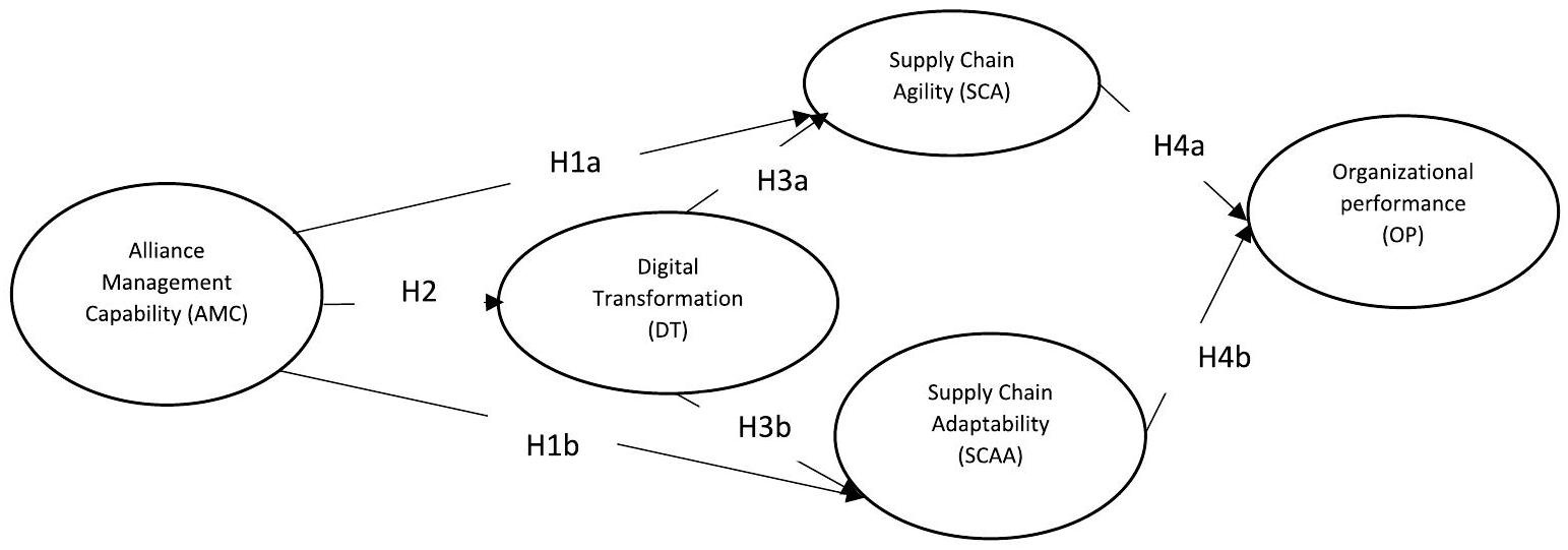 et وآخرون، 2021؛ باباناجنو وآخرون، 2022)، سيلعب دورًا حاسمًا في تقريب شركاء سلسلة التوريد من بعضهم البعض حيث يشاركون المعلومات وينسقون أنشطتهم بشكل أفضل (لي، 2021؛ إسكاميلا وآخرون، 2021). ومع ذلك، في العديد من الحالات، لم تحقق نتائج التحول الرقمي التوقعات (هيس وآخرون، 2016؛ قوه وآخرون، 2023)، وفي بعض الحالات، أدت قدرة التحول الرقمي إلى نتائج متفاوتة (شراغ وآخرون، 2022). لذلك، هناك حاجة إلى مزيد من التحقيق لفهم تأثيرات التحول الرقمي على قدرات سلسلة التوريد ونتائج الأداء (سينتوبيللي وآخرون، 2020؛ مينغ وآخرون، 2023). في الحالات التي يكون فيها التحول الرقمي قيد التنفيذ، يمكن أن يعمل إما كوسيط بين متغيرين (نايال وآخرون، 2022؛ تسو و تشين، 2023) أو أن يكون له تأثير تفاعلي (وانغ ودو، 2022) عليهما. وهذا يعني أن التغييرات التي يحدثها التحول الرقمي يمكن أن تؤثر إما على العلاقة بين متغيرين أو تؤثر عليهما مباشرة، اعتمادًا على السياق. على وجه التحديد، ليس من المفهوم جيدًا كيف يؤثر AMC على قدرات سلسلة التوريد والأداء التنظيمي (OP) تحت تأثير التحول الرقمي كوسيط. لمعالجة هذه الفجوة المعرفية، فإن سؤال البحث الثاني لدينا (RQ2) هو: ما هي تأثيرات AMC على SCA/SCAA و OP تحت تأثير التحول الرقمي كوسيط؟