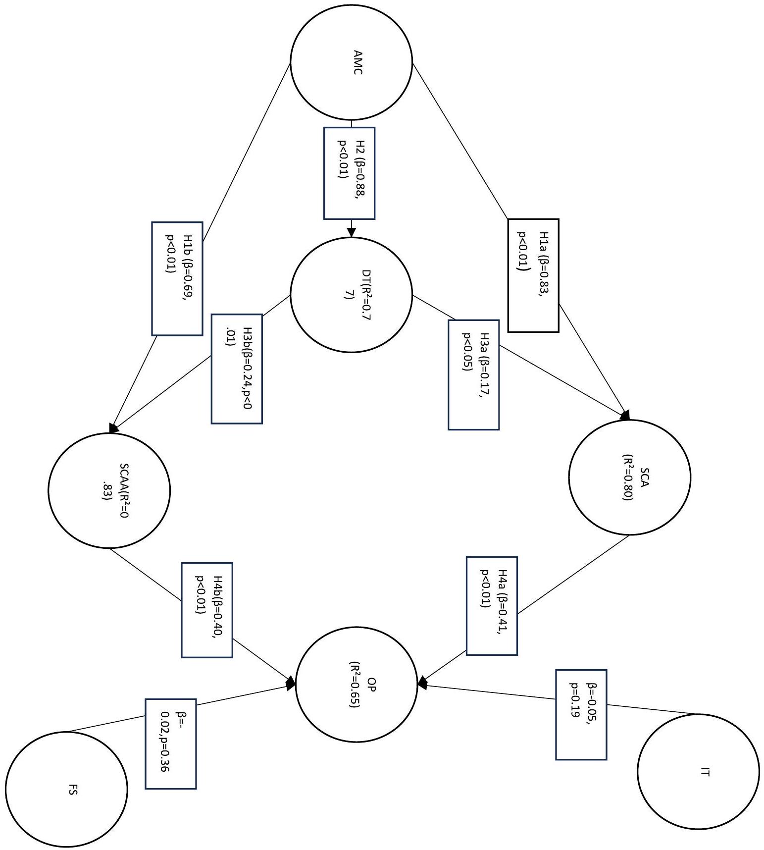 - What are the effects of AMC on the SCA/SCAA and OP under the mediating effect of DT?