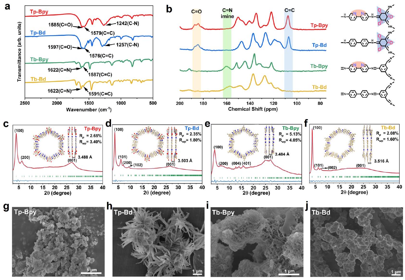 successful preparation of the . Tp-Bpy and Tp-Bd displayed distinctive signals for the carbonyl carbons ( ) at approximately and exocyclic carbons ( ) at approximately 107 ppm (Fig. 2b). On the other side, imine bonds ( ) at 157-162 ppm emerged in Tb-Bpy and Tb-Bd. The combination of FTIR and NMR analysis demonstrated the successful synthesis of four COFs at the chemical structure level.