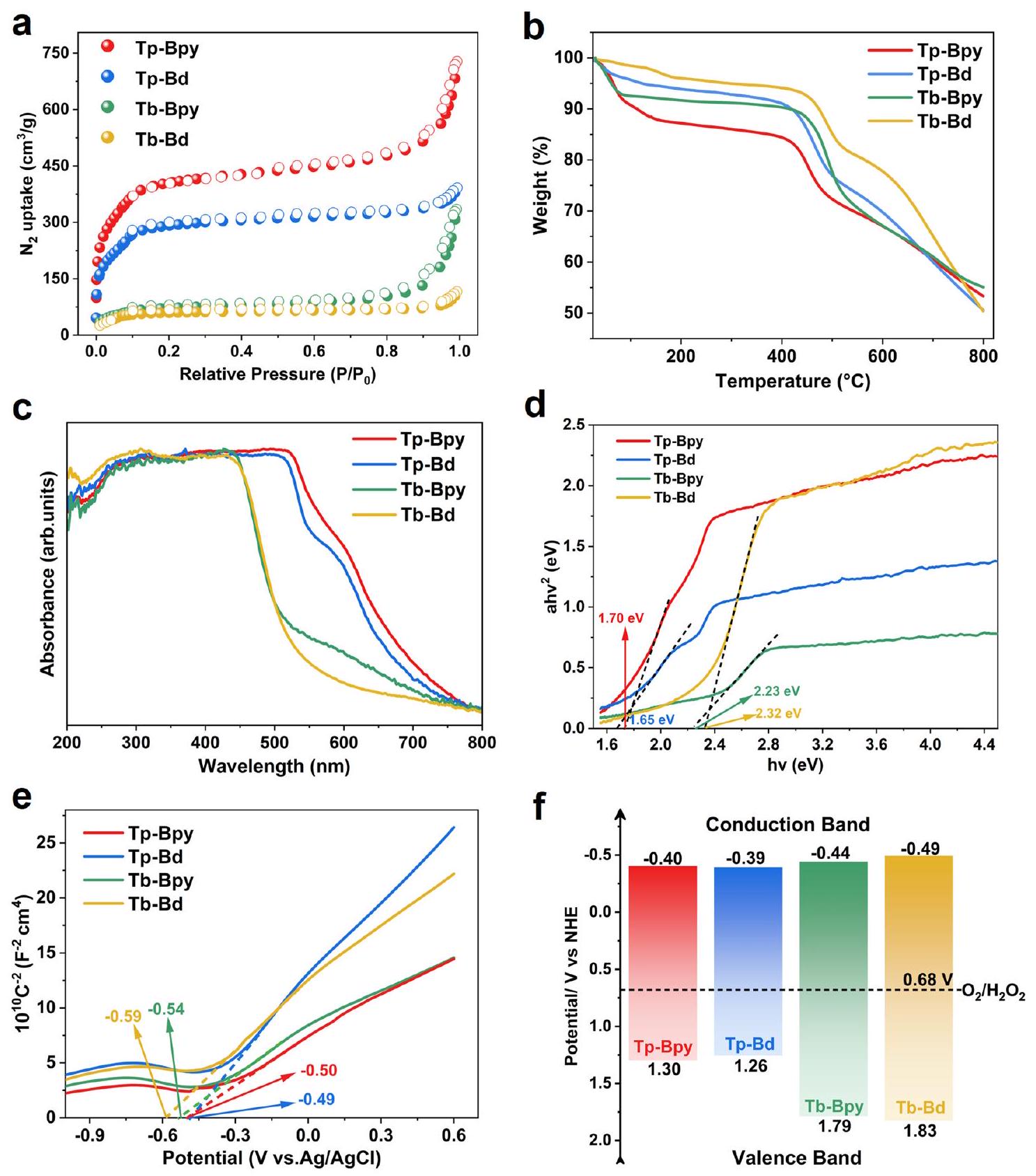 Fig. 3 | Pore structure and photoelectrochemical tests for Tp-Bpy, Tp-Bd, Tb-Bpy and Tb-Bd. a sorption isotherms. Thermal gravimetric analysis spectra. c UV-vis diffuse reflection spectra. d Kubelka-Munk-transformed reflectance spectra. e Mott-Schottky curves. f Scheme illustration of the electronic band structures.