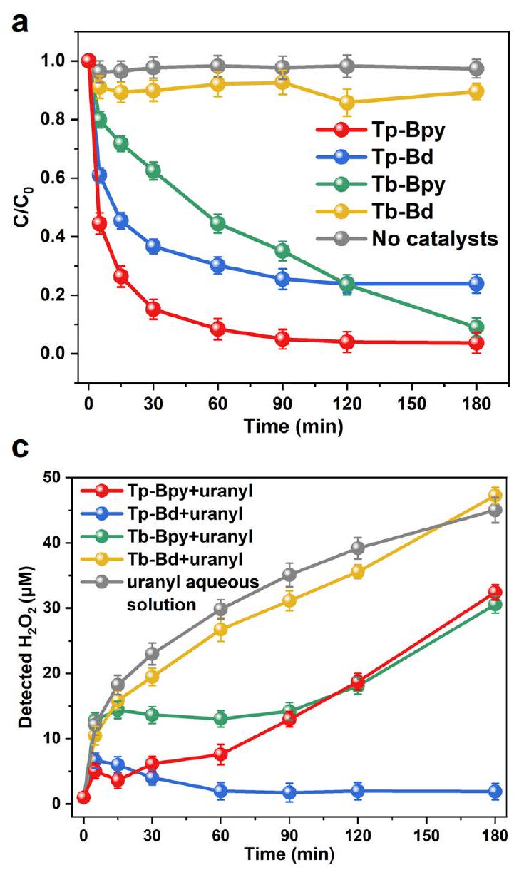 amount goes up again. For the case of Tp-Bd, in Fig. 4d, it showed that the production ability of Tp-Bd was quite poor and the adsorption of uranyl at the binding site seriously blocked the production of , thus the platform only emerged in , and there was almost no production of after 60 min thus no uranyl could be extracted as studtite in Fig. 4a. Moreover, in Fig. 4a, Tb-Bpy exhibited a relatively slower extraction rate than , but the production of by Bpy was higher than that by , which can be explained based on the following deduction. Within the first 90 minutes, although Tb -Bpy produced a higher quantity of than , Tp-Bd exhibited a significantly greater adsorption kinetics compared to Bpy as shown in Supplementary Fig. 7b. After 90 min , the rate of production of Tp-Bd decreases due to the affection of adsorbed uranyl, leading to a stagnation in uranyl extraction. In contrast, Tb-Bpy continued to produce , thus uranyl concentration continues to decline after 90 min . In the earlier stage of extraction, the quick adsorption kinetics dominates the process, while in the lateral stage when the binding sites were occupied by uranyl, the uranyl adsorption was merely stopped and the reaction between uranyl and played important role to the extraction. In brief, the different detected trends shown in Fig. 4c was the results of complicated interplay of the production and consumption of during the time course of uranyl extraction.