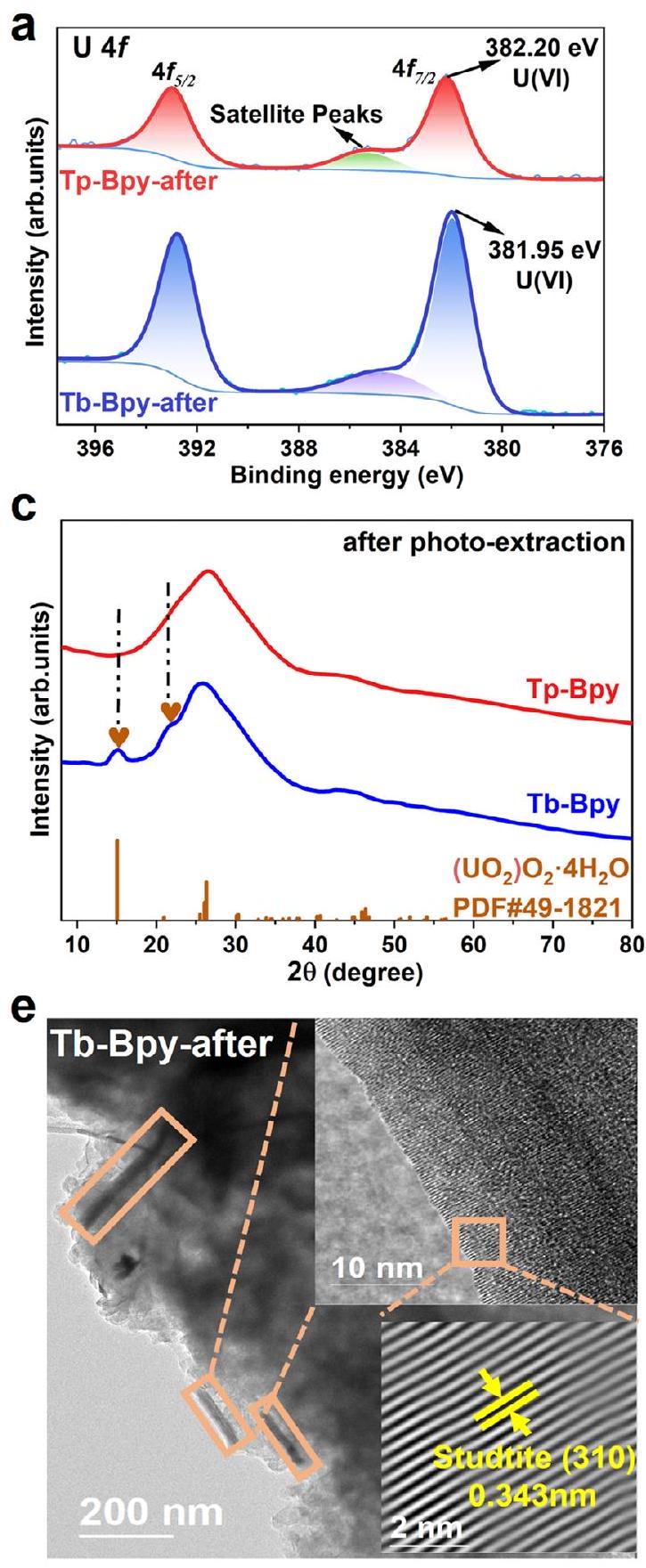 Tb -Bpy, peaks at 382.20 eV and 381.95 eV can be assigned to the of (Fig. 5a). As shown in Fig. 5b, a new peak at belonging to the bond arisen for both Tp -Bpy and Tb -Bpy after photo-extraction . Meanwhile, the unique carbonyl carbons ( ) and imine bonds ( ) for respective Tp -Bpy and Tb -Bpy maintained well after photo-extraction. For Tb-Bpy, after photo-extraction, newly emerged diffraction peaks at and suggest the formation studtite particles, while for Tp-Bpy, no additional peaks can be observed (Fig. 5c). The WT maximum contour plots of Tp-Bpy after photoextraction closely matched to the plots, which strongly supported the formation of studtite nanodots (Fig. 5d). TEM image of Tb-Bpy after photo-extraction (Fig. 5e) shows obvious rodlike studtite nanoparticles on the surface. In contrast, no obvious
