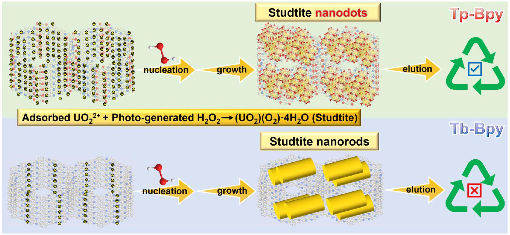 Fig. 6 | The schematic diagram for the reaction process of Tp-Bpy and Tb-Bpy. The abundant chelating sites for uranyl on Tp-Bpy are beneficial for the formation of dissolvable studtite nanodots. The limited adsorption ability for uranyl on Tb-Bpy is beneficial for the formation of large, hard-to-dissolve studtite nanorods.