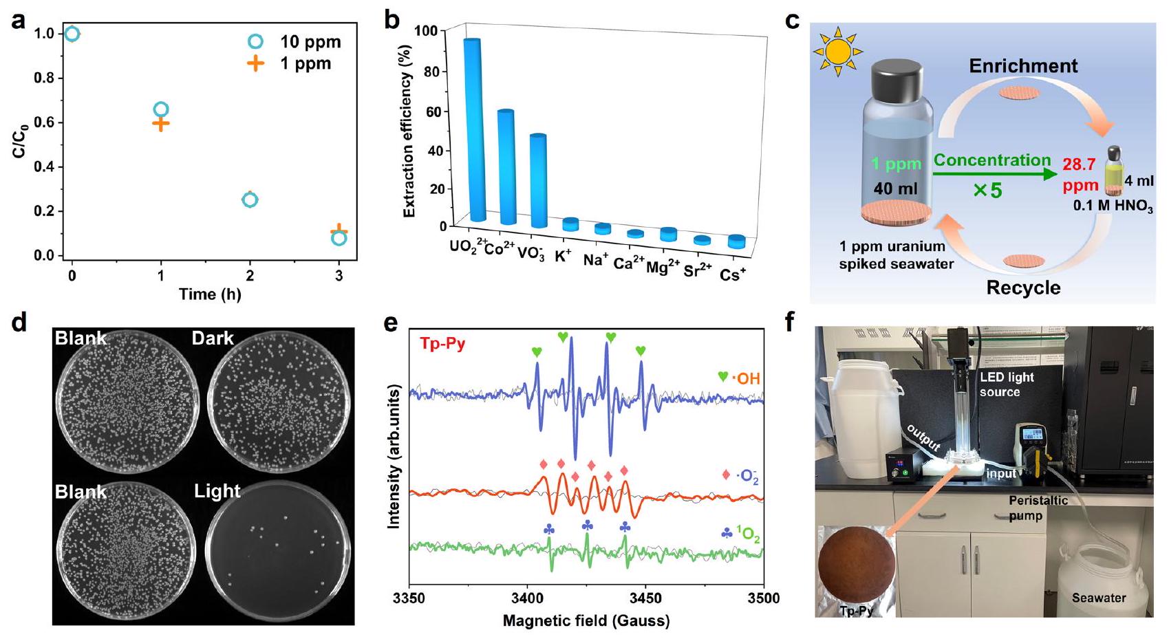 In order to verify whether the COFs with multiple chelating sites has the potential to be applied for uranyl extraction from real seawater, uranyl with low concentrations ( 10 ppm and 1 ppm ) in spiked seawater was used for photo-extraction with Tp-Bpy as photocatalyst, in which above of uranyl can be extracted (Fig. 7a). In addition, of 1 ppm uranyl in seawater can be extracted even in the presence of variable valency metal ions (Fig. 7b). After five consecutive extraction-elution cycles with 200 mL spiked seawater ( 1 ppm uranyl), 4 mL of concentrated solution with 28.7 ppm uranyl was obtained (Fig. 7c). To further investigate the practical applicability of the mentioned photo-extraction process, we examined the efficiency of extraction from natural seawater under visible light. After calculating the prime cost for the preparation of the COFs, we choose the cost-efficient Tp-Py photocatalyst for the extraction and enrichment of uranyl from seawater in scale-up test (Supplementary Table 5 and 6). Owing to the complex marine environment of microorganisms, the higher antimicrobial ability against the marine microorganism community must be considered for efficient uranyl extraction in natural seawater . The antifouling activity of Tp-Py is tested by using marine bacteria as targets (Fig. 7d). The result showed under dark condition (Supplementary Table 7), of the marine microbial community from natural seawater can be inhibited. After exposure to visible light, a markedly increased inhibition of was realized, which is supposed due to the production of reactive oxygen species (ROS) in the presence of visible light irradiation, as confirmed by the electron paramagnetic resonance (EPR) spectra (Fig. 7e and Supplementary Fig. 38). The experiments with natural seawater ( 3.3 ppb ) demonstrated that achieved an impressive