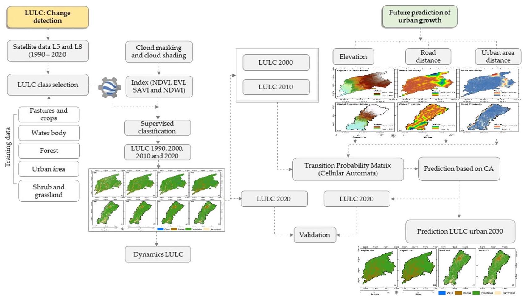 بدأت المعالجة الأولية بتجميع مناطق التدريب لكل فئة من فئات LULC داخل مناطق الدراسة. تم تحديد خمس فئات مميزة وتم التحقق منها باستخدام أجهزة استقبال GPS: (i) الأراضي الزراعية (بما في ذلك الأراضي الزراعية والبساتين)، (ii) المسطحات المائية، (iii) المناطق المبنية، (iv) الأراضي القاحلة، و(v) تغطية النباتات. تم إجراء معالجة صور الأقمار الصناعية في GEE، باستخدام مجموعات Landsat 5 (ID: LANDSAT/LT05/C01/T1_SR) للبيانات التاريخية (1990 و2000 و2010) وLandsat 8 (ID: LANDSAT/LC08/C01/T1_SR) لعام 2020. تم اختيار الصور مع إعطاء الأولوية للمشاهد ذات التغطية السحابية الدنيا والتوقيت الموسمي الأمثل لتمييز تغطية الأرض. تم تنفيذ قناع السحب باستخدام خوارزمية C Function of Mask (CFMask) لإزالة تلوث السحب والظلال. لتعزيز دقة التصنيف، تم حساب أربعة مؤشرات نباتية: