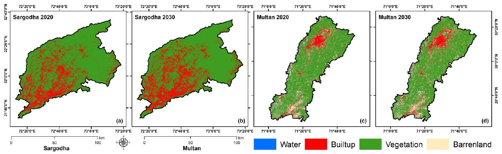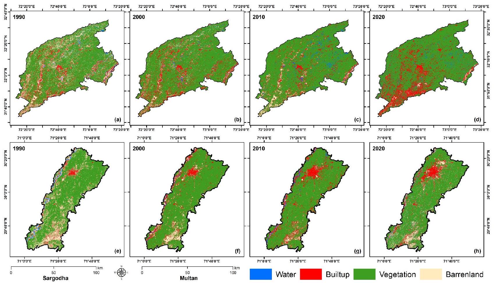 لقد زاد التوسع الحضري والتغيرات في استخدام الأراضي/غطاء الأرض (LULC) بشكل مكثف في العقود الأخيرة بسبب النشاط البشري، مما يؤثر على المناظر الطبيعية البيئية والتنموية. درست هذه الدراسة التغيرات التاريخية والمتوقعة في LULC وأنماط النمو الحضري في منطقتي ملتان وسرغودها، باكستان، باستخدام صور الأقمار الصناعية من لاندسات، والحوسبة السحابية، ونمذجة التنبؤ من 1990 إلى 2030. تم تقسيم تحليل صور الأقمار الصناعية إلى أربع فترات زمنية (1990-2000، 2000-2010، 2010-2020، و2020-2030). سهلت منصة محرك جوجل الأرض السحابية تصنيف صور لاندسات 5 ETM (1990، 2000، و2010) وصور لاندسات 8 OLI (2020) باستخدام نموذج الغابة العشوائية. تم استخدام نموذج محاكاة يدمج الأوتوماتا الخلوية وشبكة عصبية اصطناعية متعددة الطبقات في ملحق MOLUSCE من QGIS للتنبؤ بالنمو الحضري حتى عام 2030. أظهرت الخرائط الناتجة مستويات دقة عالية باستمرار تتجاوز