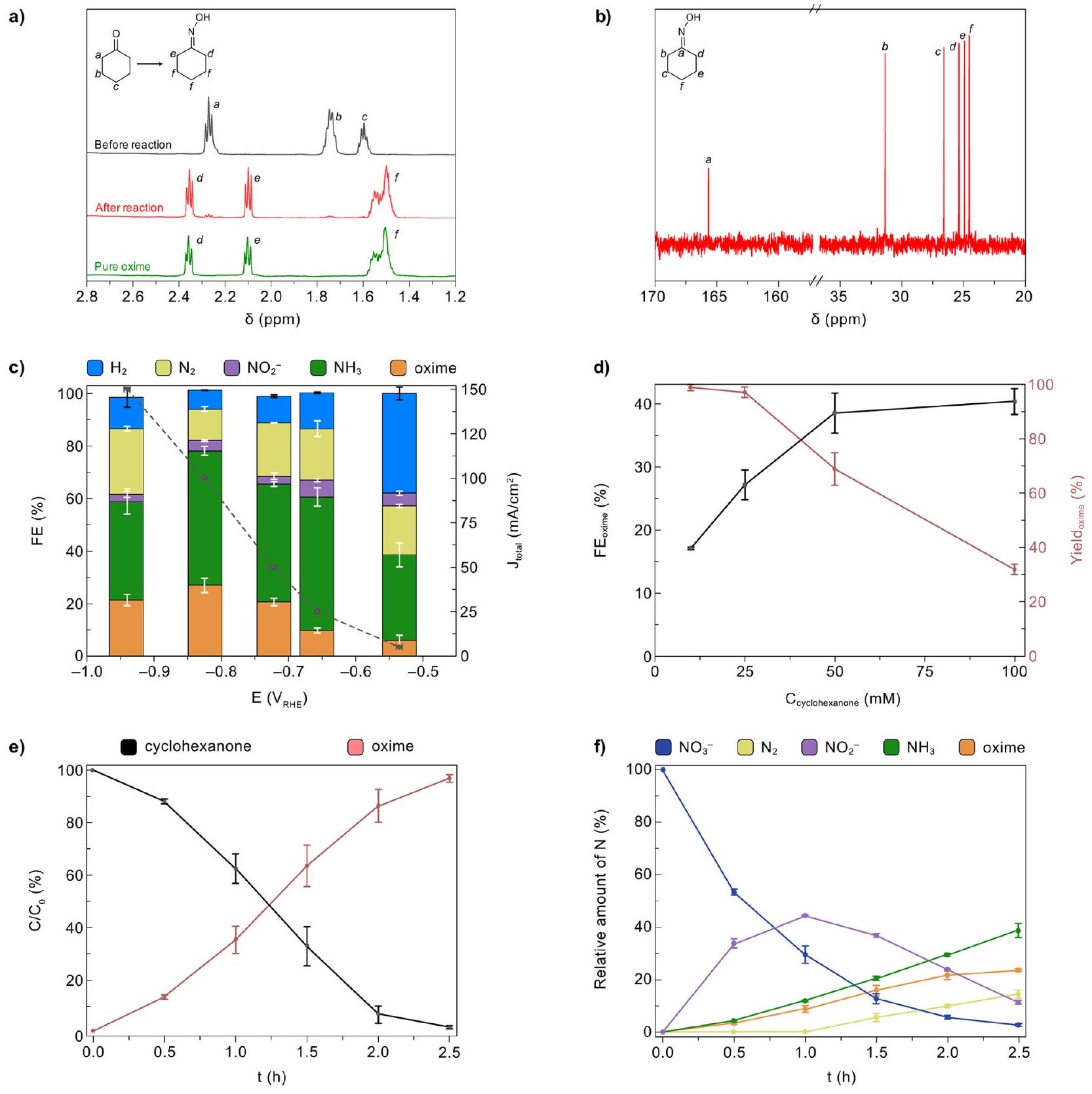 عملية كيميائية-كيميائية (EChem-Chem) للتخليق في وعاء واحد لأوكسيما السيكلوهكسان باستخدام نترات مائية كمصدر للنيتروجين (الشكل 1 ب) وتقديم تحقيق متعمق حول كيفية التحكم في انتقائية المنتج من خلال امتصاص السطح لعينات النيتروجين. سلسلة من