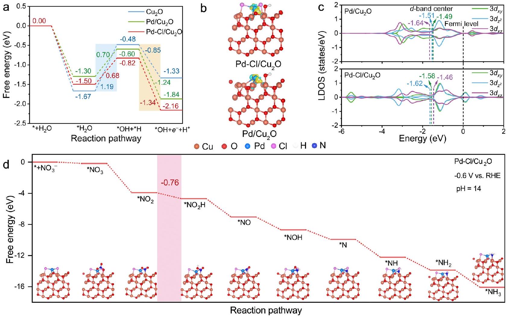 لتحقيق تأثير تنسيق الكلور علىتم حساب التشكيل، توزيع الشحنة التفاضلية وكثافة الحالات المحلية (LDOS). من فرق كثافة الشحنة (الشكل 2ب)، تم تحديد ذرتي الكلور.كلاهما حصل عليه“، الذي تم تزويده بواسطة ذرة البالاديوم المنسقة (بالإضافة إلى المساهمة منالركيزة. لقد استحوذ ligand Cl ذو الألفة القوية للإلكترون الأول على الإلكترونات منوأدى إلى تحول نحو الأسفل و -مركز الشريط لذرة البالاديوم في مقارنةً بـ ، بالإضافة إلى تحول للأعلى-مركز نطاق Pd (الشكل 2c). وبالتالي، تحت تنظيم ligand Cl، تم تحويل-مركز النطاق لبوديم (Pd) مكن *H على المحفز للحصول على المزيد من الإلكترونات ( ) واصنع أكثر عدم استقرار للترويج لـإصدار (الشكل 2ب).