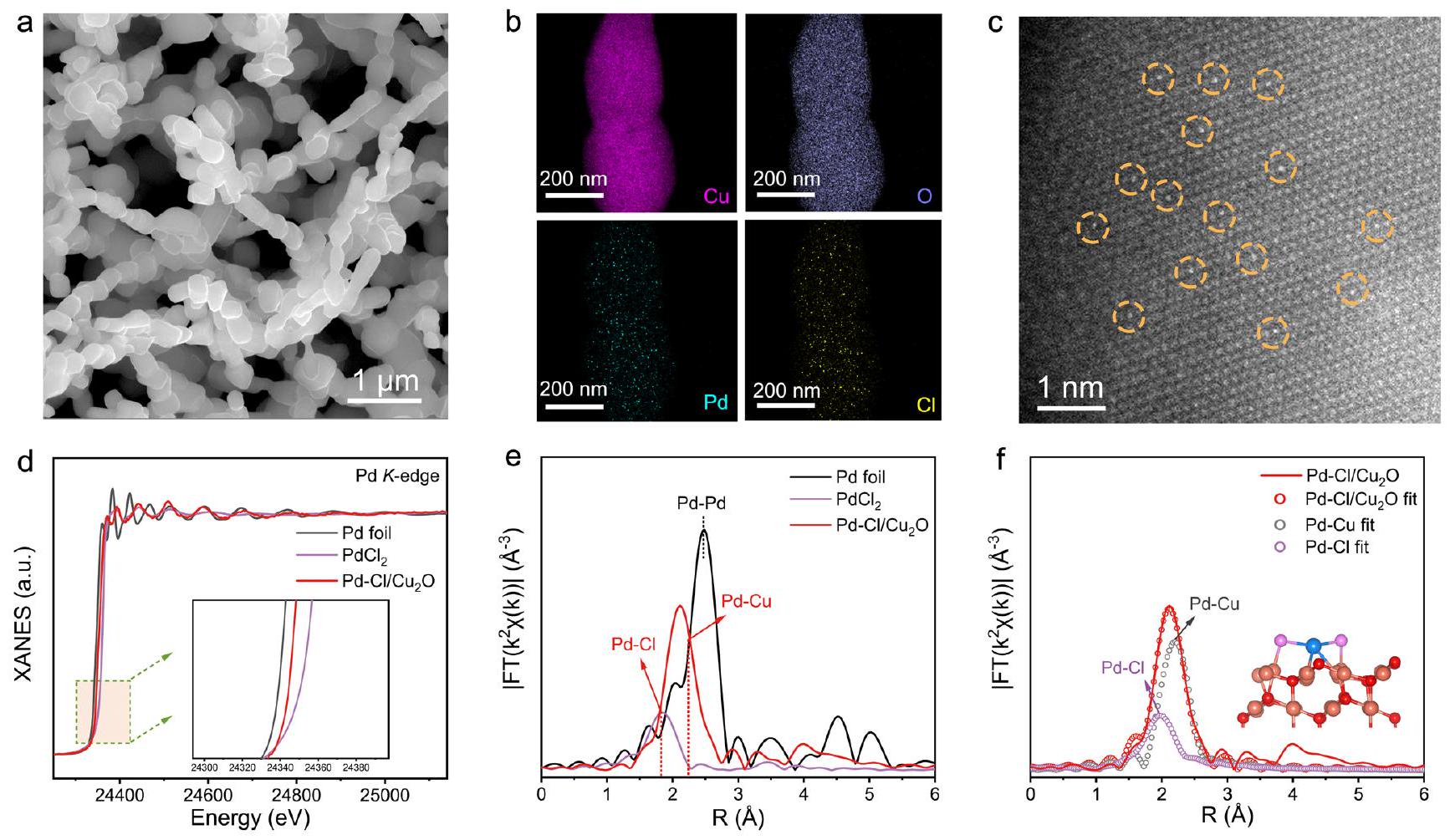 Fig. 3 | Synthesis and structural characterizations of Pd-Cl/Cu2O. SEM (a), EDX mapping (b), and AC-HAADF-STEM images (c) of Pd-Cl/Cu2O. Pd K-edge XANES spectra (d), and -weighted EXAFS spectra (e) of and reference samples. The fitting EXAFS spectra of . Inset: fitting model.