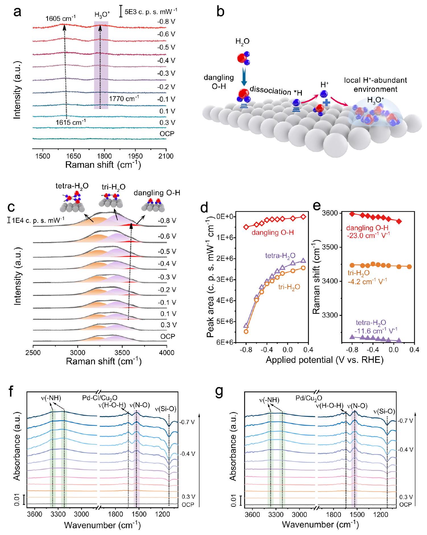تم إنشاؤه بواسطةتم إزالة الانفصال على الفور منسطح، لبناء محلي-بيئات غنية في ظروف pH مرتفعة (الشكل 4 أ، ب). الشكلتيمكن أن يتراكم بشكل مستقر على سطح الكاثود المحلي. لتمييز نوع المفكوكقمنا بتحليل قمم الظرف عندالتي يمكن تفكيكها إلى ثلاثة أنواع من الواجهاتبما في ذلك الماء المنسق رباعياً (تترا- الماء المنسق ثلاثيًا (ثلاثي- ) و متدلي روابط الماء (معلقة )، على التوالي . يمكن أن تختلف الأنواع الثلاثة من الماء الواجهاتي كدالة لجهد القطب بسبب تأثير ستارك. عند الجهود السلبية الأكثر، ستصبح التغيرات في شدة القمة وتحول هذا الماء الواجهاتي واضحة وفقًا لذلك. مقارنةً بالتترا- وثلاثي-يتدلىأظهر الماء تغييرًا أكثر سلاسة في المنطقة وانحدارًا أكثر حدة. ) مع انخفاض الجهد (الشكل 4c-e)، مما يؤكد التفكك التفضيلي للروابط المعلقة الماء على. على الرغم من حدوث تفكك سريع لذرات الأكسجين والهيدروجين المعلقة في الماء أيضًا عبر (الأشكال التكميلية 26، 27)، غير المكتشفة القمم اقترحت الصعوبة في التبرع(الشكل التوضيحي 26a)، بسبب الارتباط القوي لـعلى Pd دون وساطة Cl. بالإضافة إلى ذلك، التحول غير الواضح لـذروة ( ) و القليل جداً ذروة تجلت الفقرانفصال مع القليلتغطية على (الشكل التوضيحي 28). لذلك، تحت وساطة يمكن أن تعزز المحفزات التعلقتفكك الماء لبناء المحليبيئات وفيرة في ظروف قلوية.