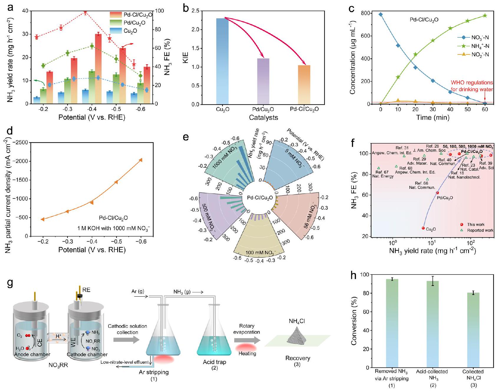 current densities of Pd-Cl/Cu2O in a 1 M KOH electrolyte with under the potential range from -0.2 to -0.6 V vs. RHE . e yield rate of in a 1 M KOH electrolyte with different concentrations for 1 h of electrolysis. f performance comparison of reported electrocatalysts. Schematic of the ammonia product synthesis process from electrolyte to for 5 h electrolysis at -0.6 V vs. RHE. h The conversion efficiency of different steps for the ammonia product synthesis process. Numbers on the -axis indicated the corresponding conversion steps in panel . Error bars indicate the relative standard deviations of the mean ( ). See “Methods” for experimental details.