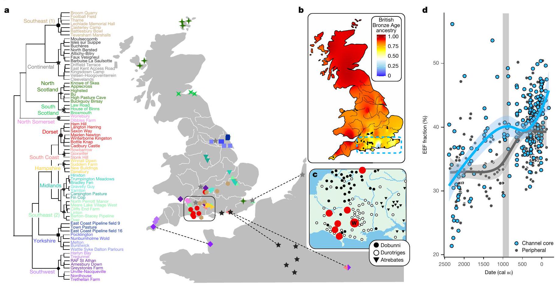من المواقع من مجموعة دورست (الدوائر الحمراء) الموضوعة ضمن التوزيع الإقليمي لقطع النقود من نوع دوروتريجز. يتم الإشارة إلى WBK بـ ‘W’. تم رسم التوزيعات وفقًا للمراجع 34، 35. د، تُظهر نسبة سلالة EEF عبر الزمن لمنطقة القناة ذات التأثير القاري (باللون الأزرق؛ محددة بخط متقطع في ب) زيادة في أواخر العصر الحديدي لم تُلاحظ في العينة من بقية إنجلترا وويلز (باللون الأسود). منطقة القناة الأساسية تقع شرق خط الطول